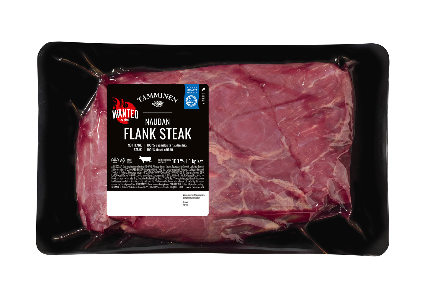 Tamminen Naudan Flank Steak leikataan ja viimeistellään käsityönä 100 % suomalaisesta naudan kupeesta amerikkalaistyylisellä leikkuumenetelmällä. Kookas naudanlihapihvi on väriltään tumman sävyistä ja omaa syvän, lihaisan maun. Kypsennetään pistinpannulla paistaen voin tai kuumakestoisen öljyn kera tai vaihtoehtoisesti grillissä grillaten. Suositellaan leikattavan vastasyyhyn ohuina viipaleina. Soveltuu käytettäväksi lämpimiin salaatteihin, alkuruokiin tai pääruoaksi lisukkeiden kera. Yksittäisen tuotteen keskimääräinen paino on 500 g.