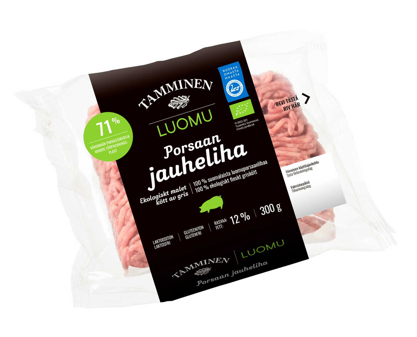 Tamminen Luomuporsaan jauheliha valmistetaan 100 % suomalaisesta luomuporsaanlihasta. Jauheliha voidaan kypsentää sellaisenaan paistinpannulla paistaen, jolloin liha murennetaan sen ruskistamisen aikana. Soveltuu käytettäväksi kastikkeisiin, keittoihin, pitsoihin ja piiraisiin. Jauhelihasta valmistuvat vaivattomasti myös lihapyörykät, jauhelihapihvit ja murekkeet.