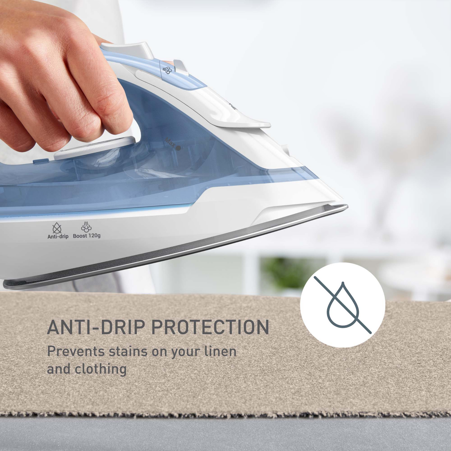 Kompaktin muotoilun, ergonomisen kahvan ja läpinäkyvän 240 ml vesisäiliön ansiosta silittäminen sujuu helposti ja miellyttävästi. Kaikkien Tefalin silitysrautojen laatu testataan ennen toimitusta, joten joidenkin laitteiden vesisäiliössä voi olla pieniä määriä vettä tai tiivistynyttä kosteutta.