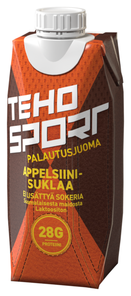 Markkinoiden parhaimman makuiset TEHO Sport palautusjuomat on valmistettu suomalaiseen laktoosittomaan lähimaitoon. TEHO Sport Appelsiini-suklaa ei sisällä lisättyä sokeria, ainoastaan maidossa luonnollisesti olevan määrän. Tuote on runsasproteiininen, yksi tetra sisältää 28g proteiinia ja vain 5,2g / dl hiilihydraatteja. Tuote on makeutettu makeutusaineilla, mutta ilman aspartaamia.