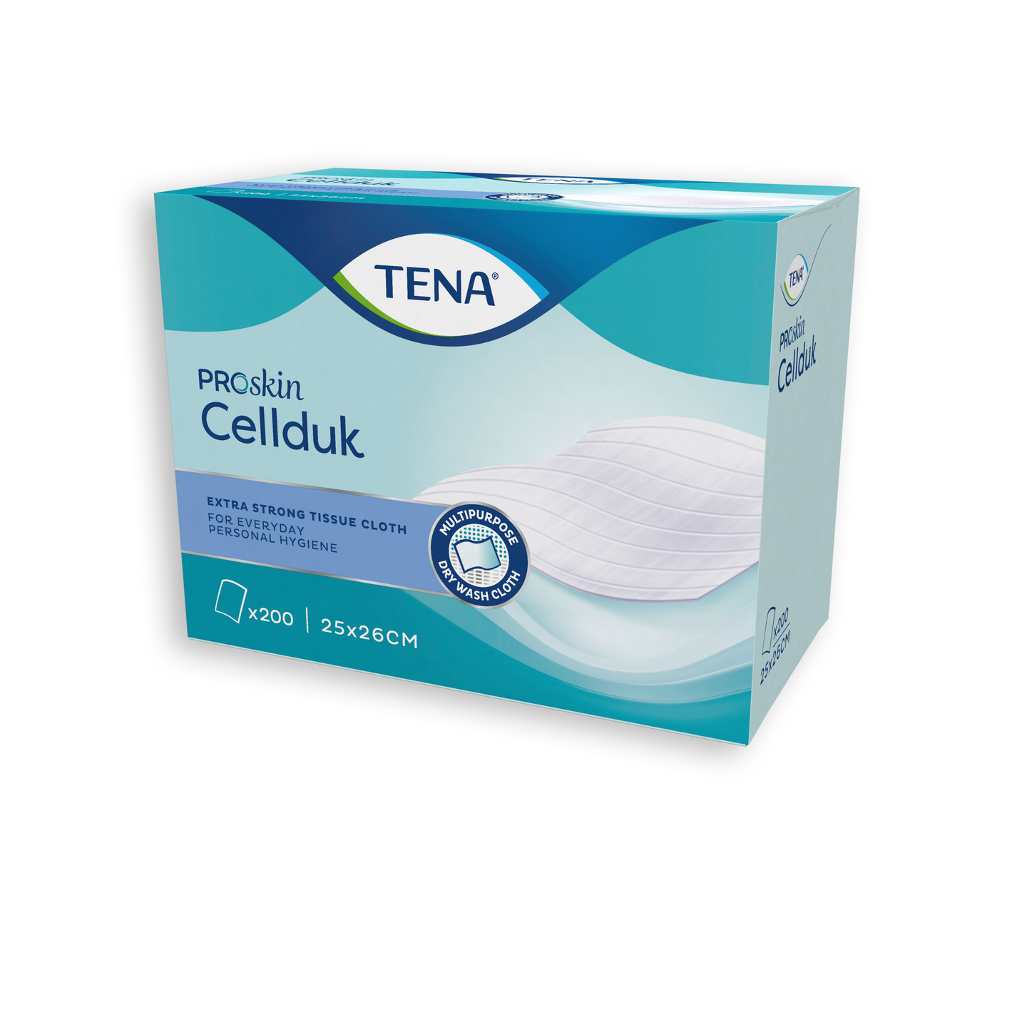 Perinteinen pesulappu, joka sopii mainiosti inkontinenssin hoitoon sekä koko kehon puhdistamiseen. TENA Cellduk on aikuisille suunniteltu kestävä sekä hellävarainen pesulappu, jolla herkän ikääntyvän ihon hoito on helppoa. Tämä erittäin imukykyinen, kestävä ja suurikokoinen pesulappu ei hajoa. Käytä märkänä TENA Wash Cream Pesuvoiteen, TENA Wash Mousse Pesuvaahdon tai TENA Body Oil Ihoöljyn kanssa päivittäisen henkilökohtaisen hygienian ja ihon hoidossa. Nukkaamaton selluloosa ja sitä tukevat langat tekevät pesulapusta erittäin kestävän myös märkänä.