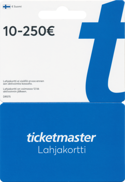 Musiikki, urheilu, teatteri, perhe, festivaalit! Lahjakortilla voit ostaa Ticketmaster Suomen välittämiä lippuja ja tuotteita Ticketmasterin verkkokaupasta ja lippukaupoista. Kortti on voimassa 12kk ostopäivästä. Lahjakortille voit vapaasti valita ladattavan arvon väliltä 10-250 EUR. Lahjakorttien valikoima saattaa vaihdella kaupoittain.