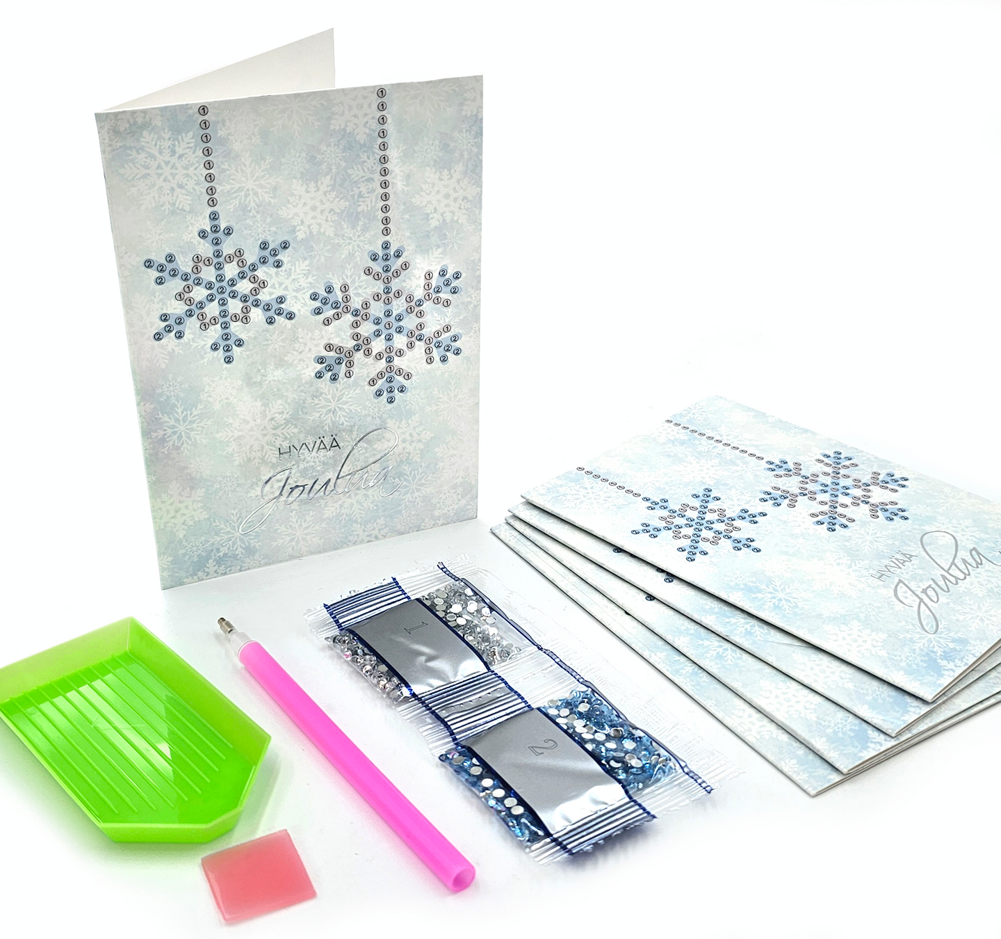 Timanttimaalauskortti askarteluun. Kiinnitä timantit korttipohjaan ja luo upea timanttimaalauskortti! Pakkauksessa on viisi korttipohjaa, vaha, timanttityökalu, astia timanteille ja timantit. Värit on lajiteltu omiin pusseihin numeroittain ja korttipohjaan on merkitty kunkin värin paikka. Pakkauksen takana on tarkemmat ohjeet timanttimaalauskortin askarteluun. Taitetun kortin koko on A6. Timanttien halkaisija on 3mm.