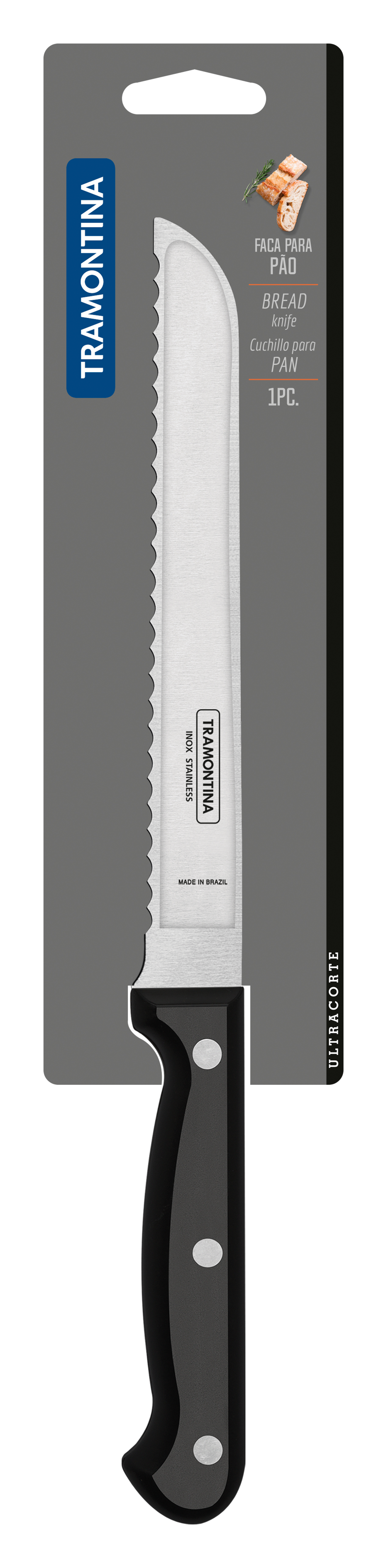Ruostumattomasta teräksestä valmistetun laadukkaan leipäveitsen sahalaitainen terä läpäisee kovakuorisenkin leivän. Tramontinan Ultracorte-sarjan veitsissä on antibakteerinen ja ergonominen kolmen alumiininastan kahva, joka on valmistettu kestävästä polypropeenista. Laadukkaiden keittiöveisten terä jatkuu saumattomasti kahvan läpi. Voidaan pestä astianpesukoneessa.