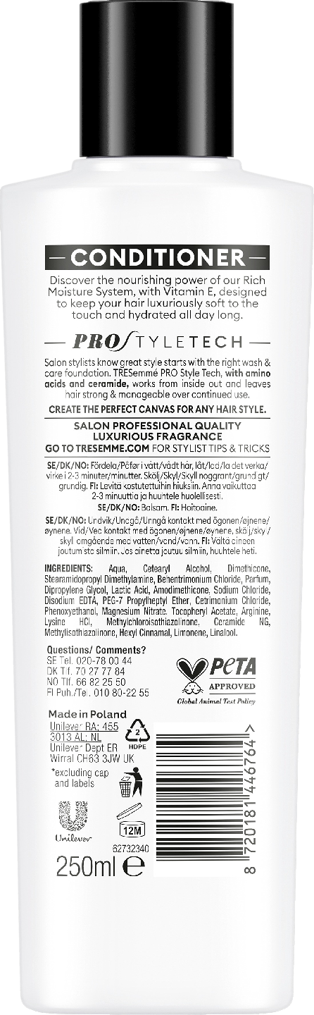 TRESemmé Rich Moisture on ammattilaatuinen kosteuttava hoitoaine, joka on kehitetty erityisesti kuiville ja vaurioituneille hiuksille. Sen edistyksellinen kosteusteknologia antaa elinvoimaa ja tekee elottomista hiuksista kiiltävät ja pehmeät. TRESemmé Rich Moisture on täydellinen valinta sinulle, joilla on kuivat tai vaurioituneet hiukset, mutta haluat saada salonkitason kampauksen ja kiiltävän tuloksen. TRESemmé Rich Moisturen avulla hiuksistasi tulee kosteutetut, kiiltävät ja helpommat käsitellä – ilman että ne kuitenkaan tuntuvat raskailta. TRESemmé Rich Moisture -hoitoaineessa on hellävarainen koostumus, johon on lisätty E-vitamiinia, joka korjaa kosteuttaa hiuksia latistamatta niitä. TRESemmé Rich Moisture sopii päivittäiseen käyttöön uuden teknologiamme ansiosta, joka puhdistaa hiukset hellävaraisesti mutta tehokkaasti. Parhaan tuloksen saavuttamiseksi pese hiukset TRESemmé Rich Moisture -shampoolla ja jatka sen jälkeen TRESemmé Rich Moisture -hoitoaineella. Viimeistele kampaus mieleiseksi TRESemmé suosikkimuotoilutuotteillasi. Näin peset ja hoidat hiuksiasi oikein käyttämällä TRESemmé Rich Moisture -tuotteita: 1. Aloita pesemällä hiuksesi TRESemmé Rich Moisture -shampoolla. 2. Levitä sitten sopiva määrä Rich Moisture -hoitoainetta hiusten keskipituudesta latvoihin. Hiero loput aineesta hiusjuuriin. 3. Käy hiukset läpi harvapiikkisellä kammalla tai sormenpäilläsi, jotta kaikki takut aukeavat ja hoitoaine leviää hiuksiin kauttaaltaan. 4. Anna vaikuttaa 2–3 minuuttia ja huuhtele sitten huolellisesti. 5. Viimeistele TRESemmé-suosikkimuotoilutuotteillasi, ja tee itsellei kaunis hiustyyli. TRESemmé on aina uskonut siihen, että että tyyli on tärkeä osa sinua. Kaikki työmme perustuu arvoihimme ja viimeisimpiin trendeihin. Jokainen ainesosa tuotteissamme on valittu huolellisesti, jotta sinä voit hoitaa hiuksiasi parhaalla mahdollisella tavalla. TRESemmé on auttanut naisia ilmaisemaan omaa persoonallisuuttaan jo yli 70 vuoden ajan. TRESemmé on saanut alkunsa kampaamoista, ja sen taustalla on aina ollut yksinkertainen totuus: Jokainen nainen ansaitsee näyttää upealta ja tuntea itsensä upeaksi. Juuri siltä kuin hän olisi juuri lähtenyt kampaamosta. TRESemmé on sitoutunut luomaan kampaamotasoisia hiustenhoito- ja muotoilutuotteita, jotka ovat kaikkien saatavilla. Kampaajien inspiroimat ja testatut tuotteet auttavat sinua luomaan oman tyylisi ja tuntemaan olosi joka päivä kuin juuri kampaamosta tulleeksi. TRESemmén arvoihin kuuluu edistää itsenäisyyttä ja itseluottamusta. Ymmärrämme hiusten voiman hyvinvointisi parantajana. Siksi tarjoamme ammattimaista hiustenhoitoa, joka auttaa sinua luomaan oman tyylisi kotona ja tuntemaan olosi joka päivä kuin juuri kampaamosta tulleeksi