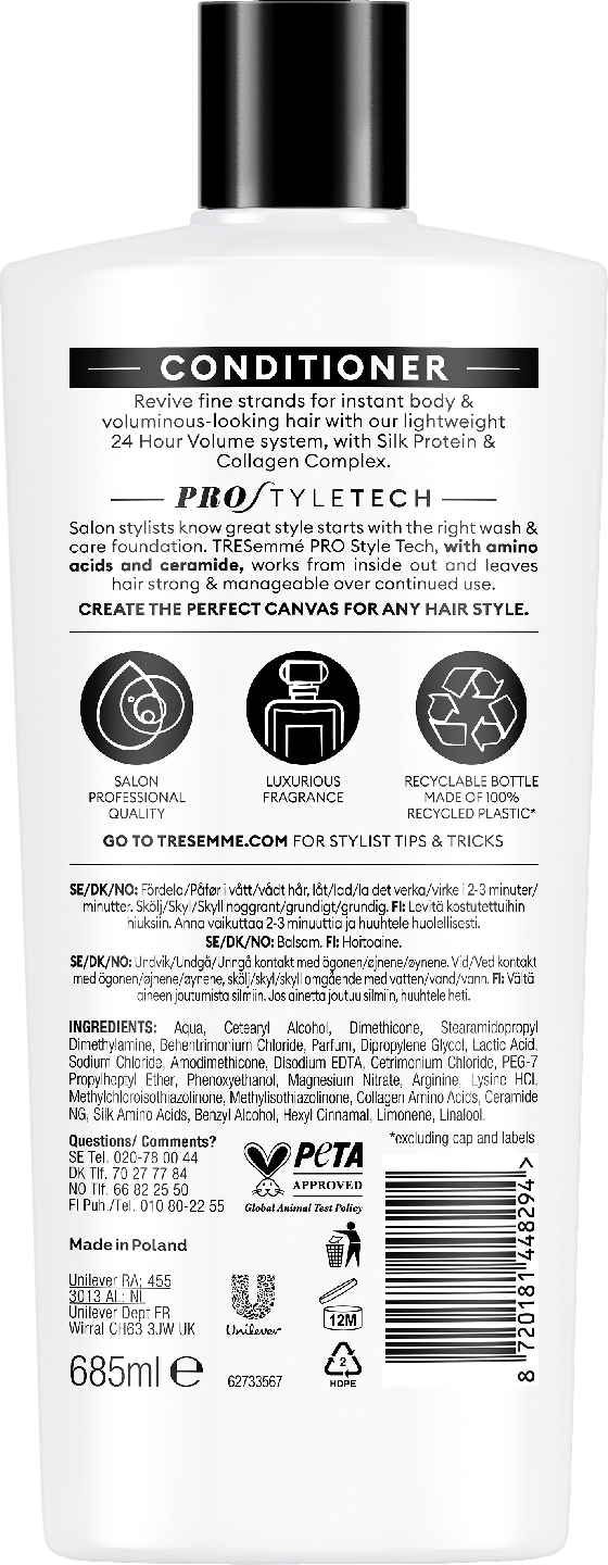 Haluatko tuuheammat hiukset, jotka tuntuvat kuitenkin kevyiltä ja liikkuvilta? TRESemmé 24H Volume -sarja on kehitetty erityisesti ohuille ja latteille hiuksille tekemään niistä paksumman ja terveemmän näköiset ja tuntuiset. Saat parhaan lopputuloksen, kun peset hiukset ensin TRESemmé 24H Volume -shampoolla ja käytät sen jälkeen 24H Volume -hoitoainetta. Muotoile hiukset lopuksi TRESemmé-suosikkituotteillasi. Anna hiuksillesi terve ja hyvinvoiva kiilto pesemällä ne TRESemmé 24H Volume Shampoolla. Purista sitten runsas määrä TRESemmé 24H Volume -hoitoainetta käsiisi ja levitä tasaisesti kosteisiin hiuksiin. Aloita levittämällä hoitoainetta hiusten keskipituudesta kohti latvoja. Hiero loput aineesta hiusjuuriin. Anna vaikuttaa 2-3 minuuttia ja huuhtele sitten huolellisesti. Viimeistele kampaus TRESemmé-suosikkimuotoilutuotteillasi. TRESemmé on auttanut naisia ilmaisemaan omaa persoonallisuuttaan jo yli 70 vuoden ajan. TRESemmé on saanut alkunsa kampaamoista, ja sen taustalla on aina ollut yksinkertainen totuus: Jokainen nainen ansaitsee näyttää upealta ja tuntea itsensä upeaksi. Juuri siltä kuin hän olisi juuri lähtenyt kampaamosta. TRESemmé on sitoutunut luomaan kampaamotasoisia hiustenhoito- ja muotoilutuotteita, jotka ovat kaikkien saatavilla. Kampaajien inspiroimat ja testatut tuotteet auttavat sinua luomaan oman tyylisi ja tuntemaan olosi joka päivä kuin juuri kampaamosta tulleeksi. TRESemmén arvoihin kuuluu edistää itsenäisyyttä ja itseluottamusta. Ymmärrämme hiusten voiman hyvinvointisi parantajana. Siksi tarjoamme ammattimaista hiustenhoitoa, joka auttaa sinua luomaan oman tyylisi kotona ja tuntemaan olosi joka päivä kuin juuri kampaamosta tulleeksi.