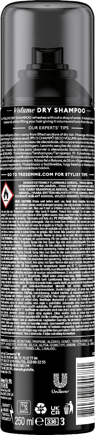 TRESemmé Day 2 Volumising -kuivashampoo on hienojakoinen sumute erityisesti rasvoittuville hiuksille. Se antaa hiuksille volyymia ja ryhtiä. Kuivashampoon mineraalisavea ja sitrusta sisältävä koostumus poistaa hiuksista ylimääräistä rasvaa, epäpuhtaudet ja pahat hajut, jotta hiuksesi tuntuvat puhtailta ja raikkailta myös päivinä, jolloin et pese hiuksiasi. Samalla TRESemmé Day 2 Volumising -kuivashampoo nostaa hiusten juuria oikean tuuheuden saavuttamiseksi. Hiusten uudelleen muotoilusta tulee helpompaa ja nopeampaa. Ei jätä näkyviä tuotejäämiä ja on helppo harjata pois. Vaikka suihkunraikas olo on ihana, et varmaankaan halua pestä hiuksiasi joka päivä. Kenellä riittäisi aikaa sellaiseen? Hiusalan ammattilaiset tietävät, että upean näköiset, tuntuiset ja tuoksuiset hiukset eivät aina edellytä vaahtoavaa shampoopesua. TRESemmé Day 2 Volumising -kuivashampoon avulla voit saada hiukset, jotka näyttävät aivan yhtä upeilta kuin kampaamokäynnin jälkeen – jopa kolme tai neljä päivää edellisestä pesukerrasta. Kuivashampoolla saat eloa jo hieman uupuneeseen kampaukseesi, ennen kuin suuntaat työpäivän jälkeen lasilliselle. Tai kun et ehdi pestä hiuksiasi kunnolla, mutta haluat pelastaa aamukiireessä itsesi tukkakatastrofilta. Luo kaunis hiustyyli TRESemmé Day 2 Volumising -kuivashampoon avulla. Näin käytät TRESemmé Day 2 Volumising -kuivashampoota: 1. Ravista kuivashampoota huolellisesti ennen käyttöä ja myös suihkausten välissä. 2. Nosta kuivia hiuksia pieni osa kerrallaan ja suihkuta valmistetta kevyesti lyhyin suihkauksin hiusjuuriin noin 20–30 cm:n etäisyydeltä. Jos suutin tukkeutuu, irrota se ja huuhtele lämpimällä vedellä. Kiinnitä suutin sitten takaisin paikalleen. 3. Odota 1–2 minuuttia ja hiero sitten valmiste hiuksiin sormenpäilläsi. 4. Harjaa aine pois hiuksista ja muotoile tavalliseen tapaasi. TRESemmé tuotteita ei ole testattu eläinkokein ja ne ovat PETA:n sertifioimia.