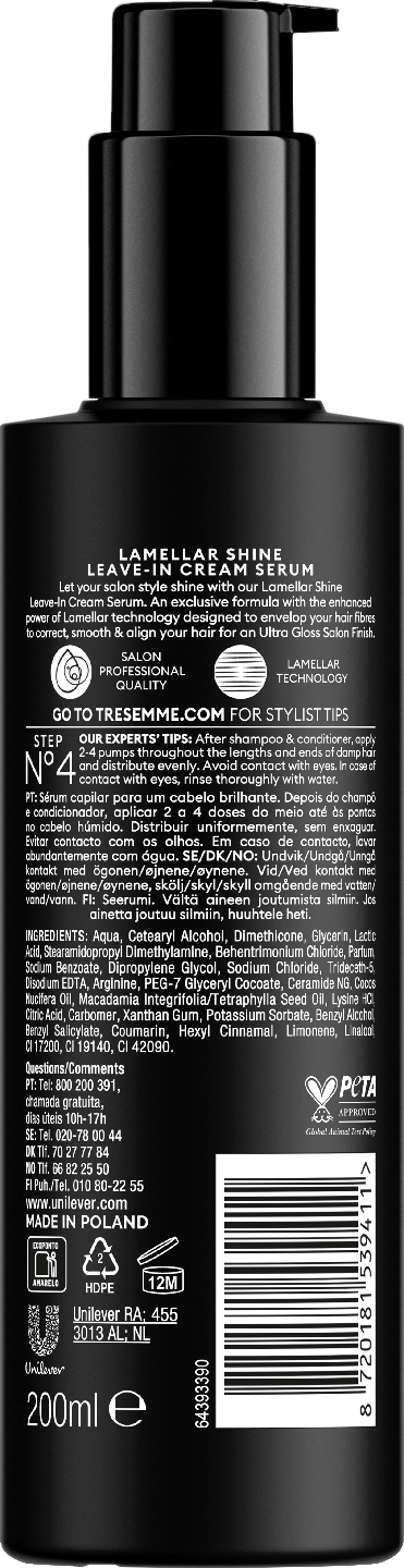 Haluatko saada kotona yhtä kiiltävät hiukset kuin kampaamossa? TRESemmé Lamellar Shine Leave-In Cream -seerumi on hiusten hoitoaine, joka hyödyntää lamelliteknologian tehoa. Se imeytyy jokaiseen hiukseen korjaten, silottaen ja selvittäen hiuksiasi ja antaa hiuksille kampaamotasoisen kiillon. Lopputuloksena ovat kiiltävät ja hoidetut hiukset. Aminohappoja ja keramideja sisältävä PRO Style -teknologia tekee hiuksista vahvat ja helposti käsiteltävät jatkuvassa käytössä. Tämä hiusten hoitoseerumi toimii sisältä ulospäin vahvistaen ja hoitaen hiuksia. Näin vaurioituneet ja kuivat hiukset saavat kaipaamaansa hoitoa. Hiusseerumia voi käyttää useilla eri tavoilla: 1. Hiuksiin jätettävänä tuotteena: Levitä 2–4 pumppausta tasaisesti kosteiden hiusten pituuksiin ja latvoihin shampoopesun ja hoitoaineen jälkeen. Sileän lopputuloksen saat, kun lisäät seuraavaksi TRESemmé Lamellar Shine Finishing -hiusöljyä. 2. Huuhdeltavana hoitona: Levitä pesun jälkeen 2–4 pumppausta tasaisesti märkiin hiuksiin. Huuhtele hiukset sitten huolellisesti ja lisää TRESemmé Lamellar Shine Conditioner -hoitoainetta. 3. Hiushoitona ennen shampoopesua, kun haluat lisää kiiltoa hiuksiisi. Me TRESemméllä olemme aina ymmärtäneet, että tyyli on enemmän kuin ulkonäkö: se on osa sinua. Ammattitasoisten tuotteidemme ansiosta voit luoda monenlaisia tyylejä. Me TRESemméllä teemme kaikki valintamme tietoisesti. Olemme valinneet arvomme, kuten eläinkokeettomuuden ja PETA-hyväksynnän, ja lisäksi valitsemme huolellisesti stylistikumppanimme ja käyttämämme raaka-aineet. Inspiraatiota ammennamme uusimmista trendeistä ja tyyleistä. Olemme jo 70 vuoden ajan uskoneet tyylin voimaan. Kerro siis tarinasi, tee työsi, jätä jälkesi – ja saavuta tavoitteesi itsevarmasti. TRESemmé-tuotteiden avulla saat toiveitasi vastaavan tyylin.