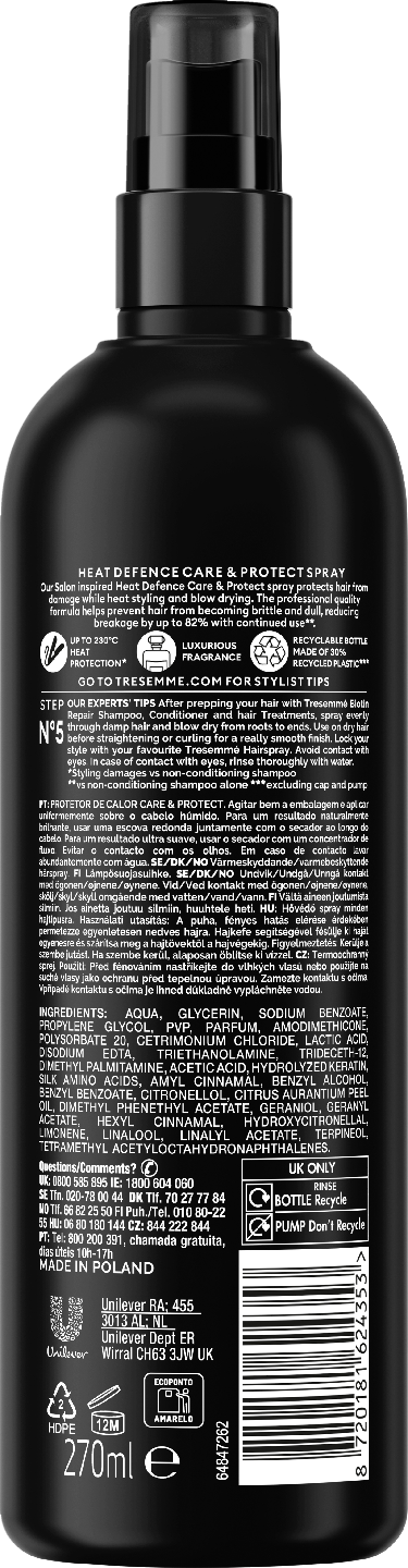 TRESemmé Heat Defence -lämpösuojasuihke tekee hiuksista pehmeät ja suojaa hiuksia kuumien muotoiluvälineiden aiheuttamilta vaurioilta. Luo itsellesi kaunis hiustyyli huoletta - voit nyt käyttää suosikkivälineitäsi hiusten muotoiluun ilman, että sinun tarvitsee huolehtia hiusten kulumisesta ja haurastumisesta! Suoja 230 lämpöasteeseen asti, ja saat upean kiillon ja eloa hiuksiisi. Kuivat hiukset? Kosteuttava vitamiinikoostumus tuo elinvoimaa hiuksillesi ja auttaa ehkäisemään hiusten kuivumista. Sopii kaikille hiustyypeille. TRESemmé Heat Defence -lämpösuojasuihke sisältää lämpöaktivoituvan koostumuksen, joka vähentää vaurioita hiuksille käytettäessä suoristusrautoja, kihartimia tai föönejä. Käytä sekä kosteisiin hiuksiin ennen föönausta että kuiviin hiuksiin ennen kihartimen tai suoristusraudan käyttöä. Tuote sopii kaikenlaisille hiuksille. Pehmeän ja kiiltävän lopputuloksen saamiseksi, suihkuta runsaasti ja tasaisesti kosteisiin hiuksiin 20–30 cm etäisyydeltä – keskeltä hiuksia kohti latvoja. Käytä harjaa ja föönaa tyvestä latvaan. Viimeistele ja muotoile kampauksesi TRESemmén hiussuihkeella. TRESemmé Heat Defence -lämpösuihkeen ovat kehittäneet hiusasiantuntijat, jotka ovat huolellisesti valinneet ainesosat parhaaseen mahdolliseen hiustenhoitoon. TRESemmé ammattimaisilla hiustuotteilla voit luoda oman hiustyylisi vahingoittamatta hiuksia. Parhaan lopputuloksen aikaansaamiseksi valitse TRESemmé shampoo ja hoitoaine ja käytä niitä osana hiustenhoitoasi. TRESemmé on omistautunut luomaan kampaamolaatuisia hiustenhoito- ja muotoilutuotteita, jotka ovat kaikkien saatavilla. On jokaisen naisen oikeus näyttää upealta ja tuntea itsensä upeaksi. Kampaamoiden inspiroimat ja kampaamoissa testatut tuotteet auttavat sinua luomaan oman tyylisi ja tuntemaan itsesi juuri kampaamosta tulleeksi joka päivä. TRESemmé tietää, että upeat hiukset antavat itsevarmuutta jokaiseen päivään. Tästä syystä koemme, että tehtävämme on tänäkin päivänä voimaannuttaa naisia kaikkialla maailmassa kävelemään pystypäin. TRESemmé tuotteita ei ole testattu eläinkokein ja ne ovat PETA:n sertifioimia.