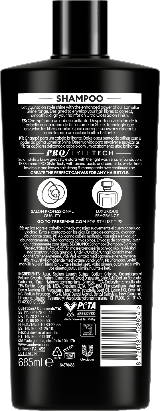 Haluatko saada kotona yhtä kiiltävät hiukset kuin kampaamossa? TRESemmé Lamellar Shine -shampoo hyödyntää lamelliteknologian tehoa. Se imeytyy jokaiseen hiukseen korjaten, silottaen ja selvittäen hiuksiasi ja antaen niille upeaa hehkua. Lopputuloksena ovat kiiltävät ja hoidetut hiukset. Aminohappoja ja keramideja sisältävä PRO Style -teknologiamme tekee hiuksista vahvat ja helposti käsiteltävät jokaisella käyttökerralla. Tämä hiuksia hoitava shampoo toimii sisältä ulospäin vahvistaen ja hoitaen hiuksia. Näin vaurioituneet ja kuivat hiukset saavat kaipaamaansa hoitoa. TRESemmé Lamellar Shine -shampoo on asiantuntijoiden kehittämä hiustenhoitoaine, jonka jokainen ainesosa on valittu huolella. Näin hiuksesi saavat aina parasta hoitoa. Jotta hiuksesi näyttäisivät mahdollisimman kiiltäviltä, aloita hiusten hoito levittämällä kosteisiin hiuksiin runsaasti TRESemmé Lamellar Shine -shampoota. Hiero hiuspohjaa hellävaraisesti sormenpäillä ja vaahdota. Huuhtele lopuksi huolellisesti. Levitä hiusten pesun jälkeen hiuksiin Lamellar Shine -hoitoaine, hiuksiin jätettävä Leave-In Cream -seerumi ja Finishing Oil -öljy. Viimeistele tarvittaessa haluamallasi muotoilutuotteella. Me TRESemméllä olemme aina ymmärtäneet, että tyyli on enemmän kuin ulkonäkö: se on osa sinua. Ammattimaiset hiustenhoitotuotteet, kuten shampoot ja hoitoaineet, auttavat sinua luomaan monenlaisia tyylejä. Me TRESemméllä teemme kaikki valintamme tietoisesti. Olemme valinneet arvomme, kuten eläinkokeettomuuden ja PETA-hyväksynnän, ja lisäksi valitsemme huolellisesti stylistikumppanimme ja käyttämämme raaka-aineet. Inspiraatiota ammennamme uusimmista trendeistä ja tyyleistä. Olemme jo 70 vuoden ajan uskoneet tyylin voimaan. Kerro siis tarinasi, tee työsi, jätä jälkesi – ja saavuta tavoitteesi itsevarmasti.
