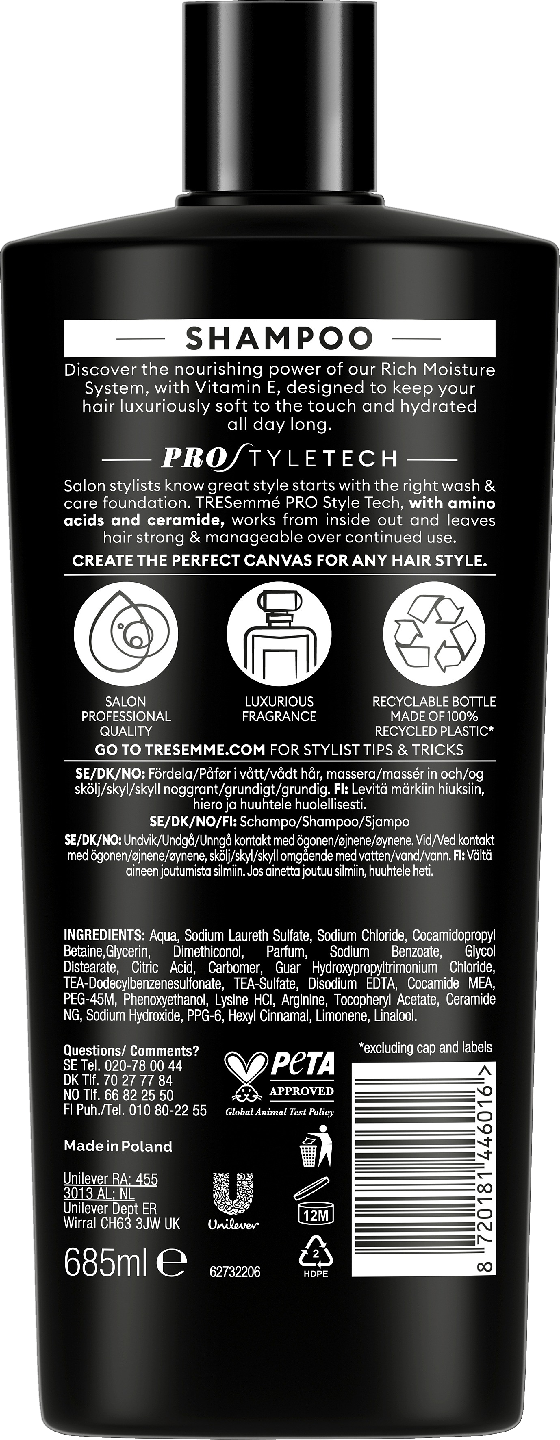 Kuivat hiukset? Tämä kosteuttava shampoo tuo hiuksiisi kampaamoista tuttua ammattilaistason tyyliä ja suorastaan kadehdittavan upeaa kiiltoa. Hellävarainen shampoo sisältää E-vitamiinia, ja se tekee hiuksistasi pehmeät ja lisää kosteutta juuri sinne, missä hiuksesi sitä eniten tarvitsevat. Parhaan tuloksen saavuttamiseksi pese hiukset TRESemmé Rich Moisture -shampoolla ja jatka sen jälkeen TRESemmé Rich Moisture -hoitoaineella. Viimeistele kampaus mieleiseksi TRESemme-muotoilutuotteilla. TRESemmé on aina uskonut siihen, että että tyyli on tärkeä osa sinua. Kaikki työmme perustuu arvoihimme ja viimeisimpiin trendeihin. Jokainen ainesosa tuotteissamme on valittu huolellisesti, jotta sinä voit hoitaa hiuksiasi parhaalla mahdollisella tavalla. TRESemmé on auttanut naisia ilmaisemaan omaa persoonallisuuttaan jo yli 70 vuoden ajan. TRESemmé on saanut alkunsa kampaamoista, ja sen taustalla on aina ollut yksinkertainen totuus: Jokainen nainen ansaitsee näyttää upealta ja tuntea itsensä upeaksi. Juuri siltä kuin hän olisi juuri lähtenyt kampaamosta. TRESemmé on sitoutunut luomaan kampaamotasoisia hiustenhoito- ja muotoilutuotteita, jotka ovat kaikkien saatavilla. Kampaajien inspiroimat ja testatut tuotteet auttavat sinua luomaan oman tyylisi ja tuntemaan olosi joka päivä kuin juuri kampaamosta tulleeksi. TRESemmén arvoihin kuuluu edistää itsenäisyyttä ja itseluottamusta. Ymmärrämme hiusten voiman hyvinvointisi parantajana. Siksi tarjoamme ammattimaista hiustenhoitoa, joka auttaa sinua luomaan oman tyylisi kotona ja tuntemaan olosi joka päivä kuin juuri kampaamosta tulleeksi. TRESemmén kaikki tuotteet ovat PETAn hyväksymiä. PETA (People for the Ethical Treatment of Animals) on maailman suurin eläinten oikeuksia puolustava järjestö. Voit siis luottaa siihen, että valitsemasi TRESemmé-tuotteen valmistuksessa ei ole käytetty eläinkokeita.