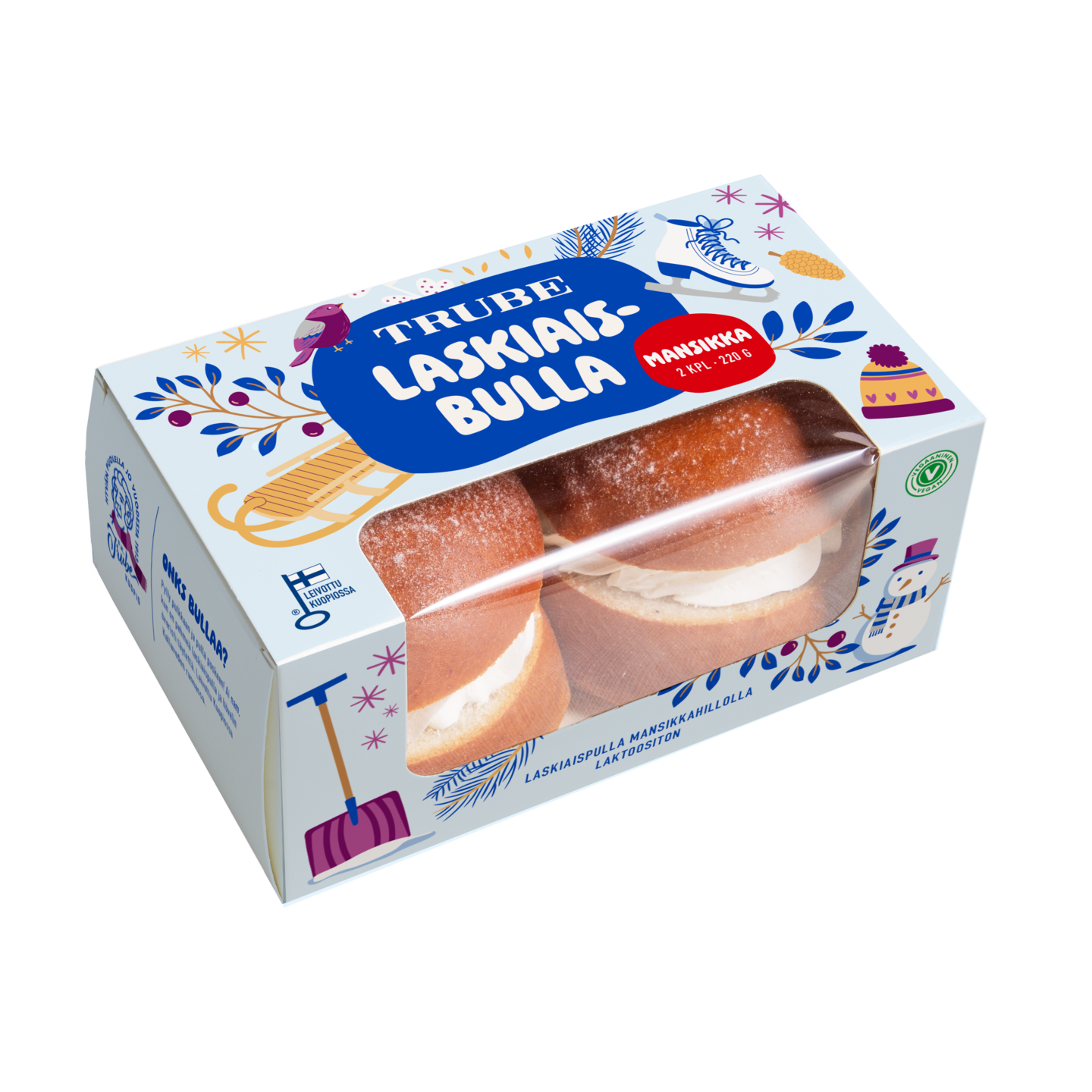 Käsin leivotussa laskiaispullassa on muhkeasti mansikkahilloa ja täyteläistä vaahtoa. Laktoositon ja vegaaninen pulla leivotaan suomalaisilla jauhoilla. Pakkauksessa on kaksi isoa pullaa -jaettavaksi tai nautittavaksi ihan itse. Trube on leiponut suomalaisia herkkuja jo vuodesta 1913. Meillä pulla ei ole vain pulla - se on talvipäivän ilo, hetki itselle ja syy nauttia laskiaisesta täysin rinnoin.