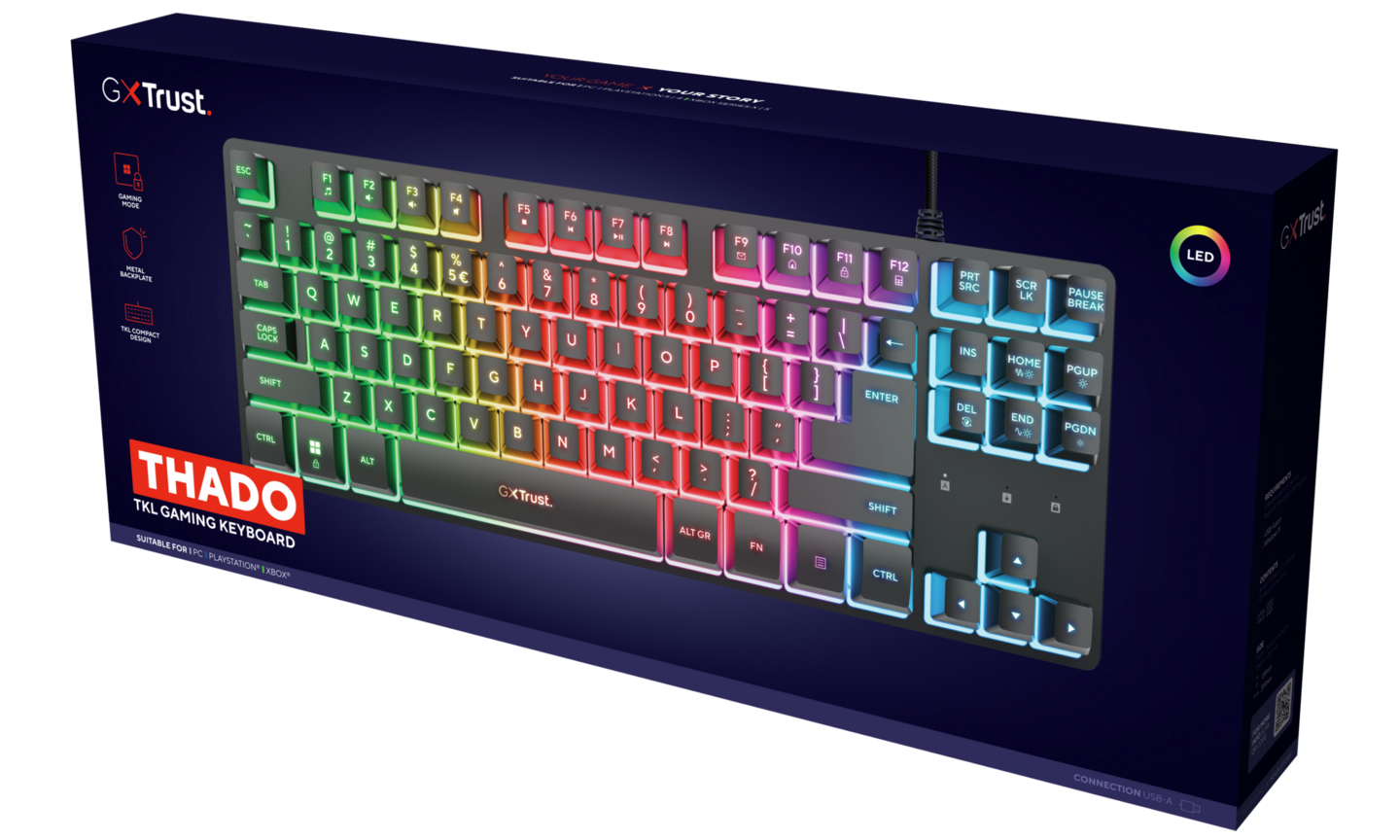Tämä tyylikäs ja kestävä TKL-pelinäppäimistö tarjoaa erinomaisen suorituskyvyn kompaktissa koossa. 20 % pienempi muotoilu säästää tilaa pöydältä ja tekee näppäimistöstä helposti mukana kuljetettavan. Monivärinen LED-valaistus hengitysefektillä tuo pelaamiseen näyttävyyttä, ja anti-ghosting-ominaisuus varmistaa jopa 10 samanaikaisen painalluksen tarkan rekisteröinnin. Tukeva metallinen taustalevy ja liukumattomat kumijalat pitävät näppäimistön tukevasti paikoillaan kovassakin pelissä. Lisäksi saat käyttöösi 12 suoraa medianäppäintä sekä pelitilan, jolla voit estää Windows-näppäimen häiritsemästä pelaamista.