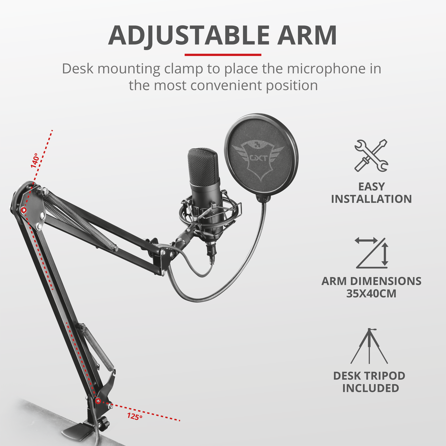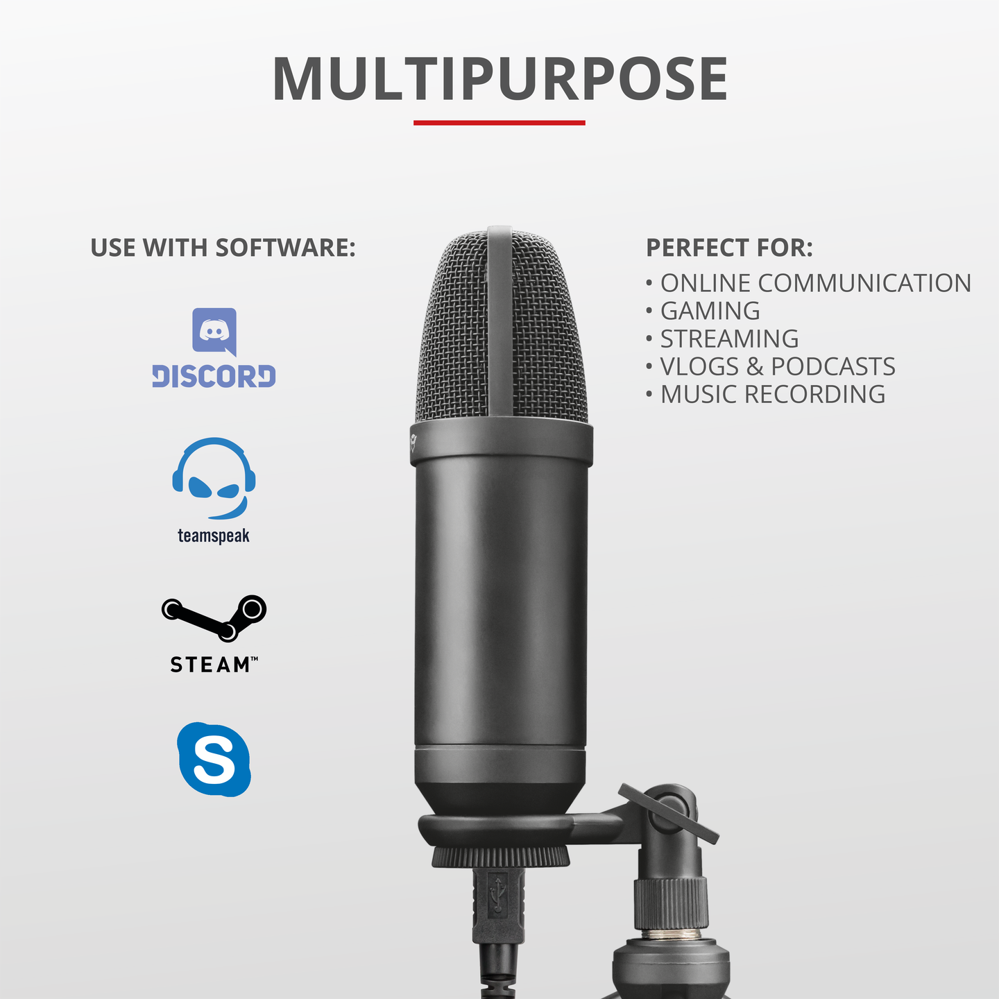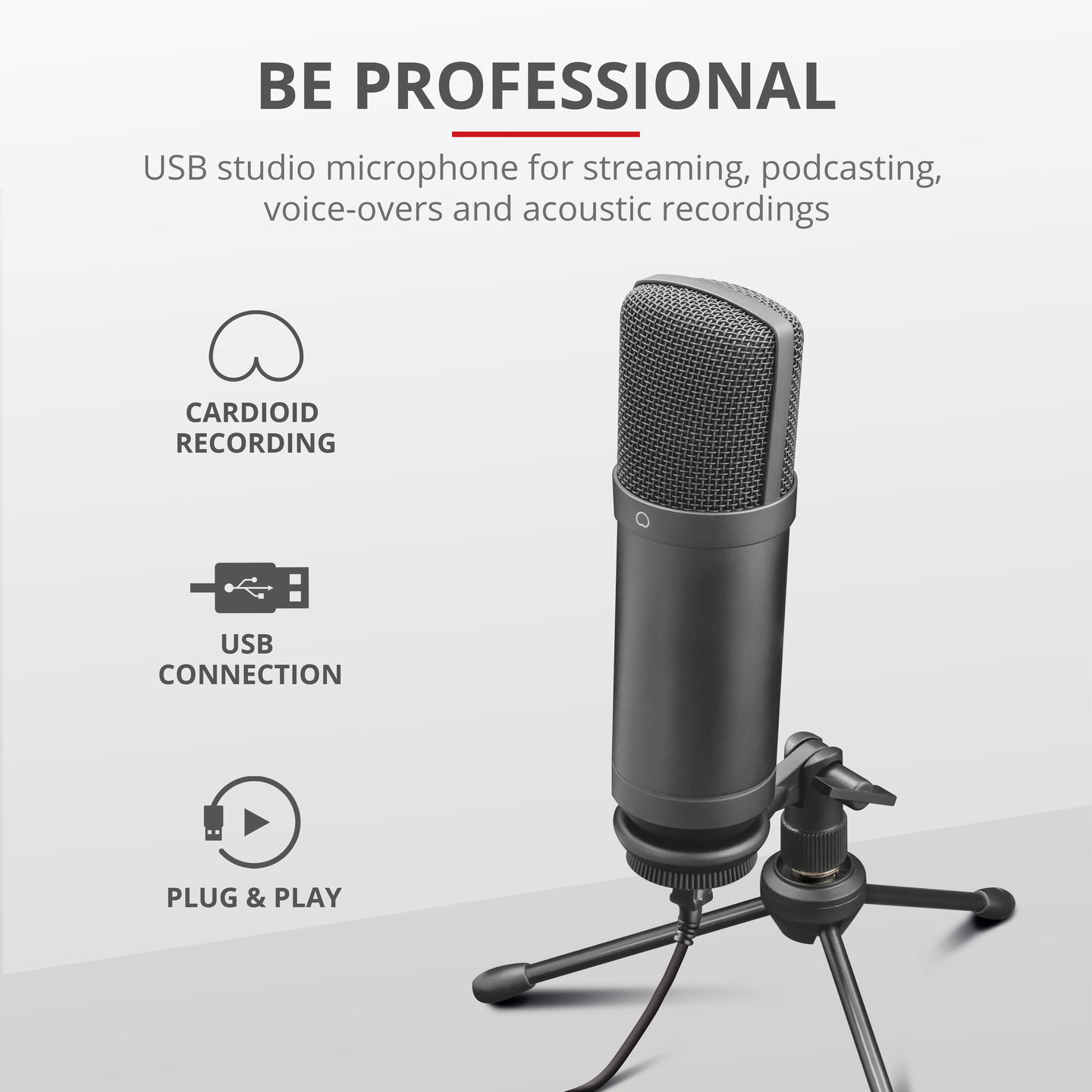 Ammattilaiskäyttöön tarkoitettu kardioidisuuntauksella varustettu USB-studiomikrofoni säädettävällä varrella. Soveltuu suoratoistoon, podcast-lähetyksiin, dubbaukseen ja akustisen musiikin tallennukseen.