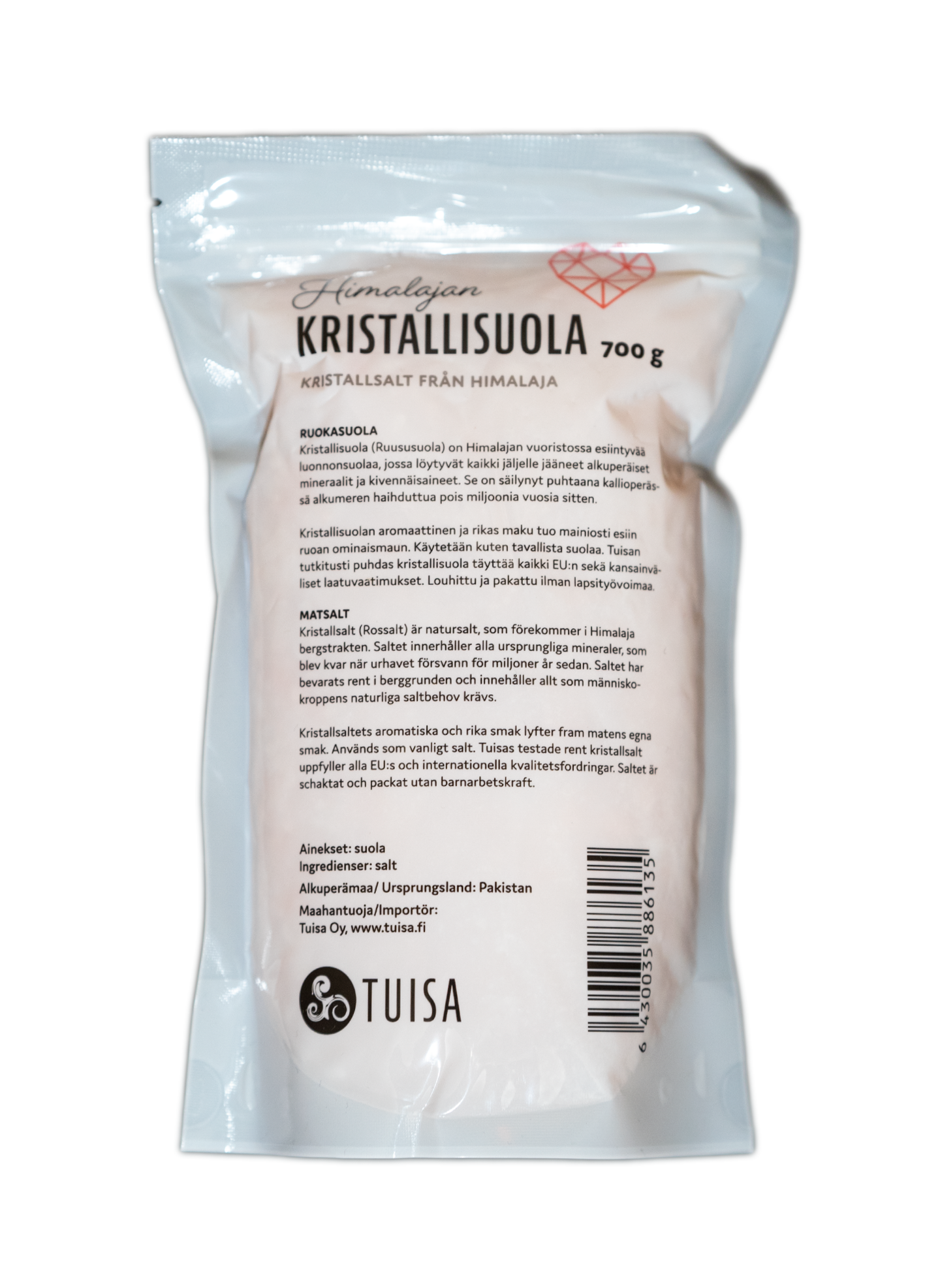 Kristallisuola (Ruususuola) on Himalajan vuoristossa esiintyvää luonnonsuolaa, jossa löytyvät kaikki jäljelle jääneet alkuperäiset mineraalit ja kivennäisaineet. Se on säilynyt puhtaana kallioperässä alkumeren haihduttua pois miljoonia vuosia sitten. Kristallisuolan aromaattinen ja rikas maku tuo mainiosti esiin ruoan ominaismaun. Käytetään kuten tavallista suolaa. Tuisan tutkitusti puhdas kristallisuola täyttää kaikki EU:n sekä kansainväliset laatuvaatimukset. Louhittu ja pakattu ilman lapsityövoimaa.