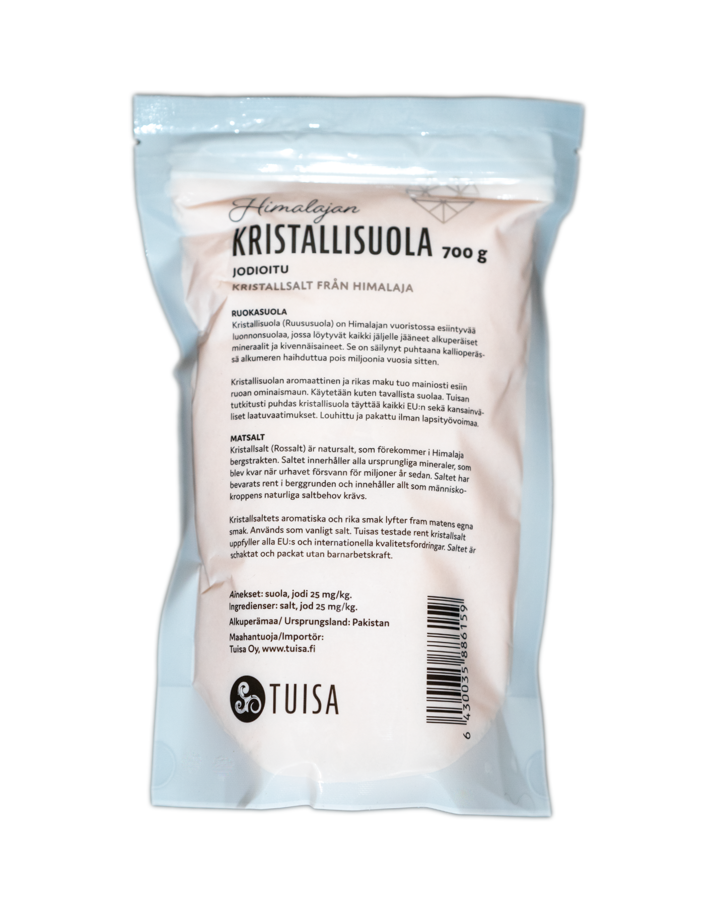 Kristallisuola (Ruususuola) on Himalajan vuoristossa esiintyvää luonnonsuolaa, jossa löytyvät kaikki jäljelle jääneet alkuperäiset mineraalit ja kivennäisaineet. Se on säilynyt puhtaana kallioperässä alkumeren haihduttua pois miljoonia vuosia sitten. Kristallisuolan aromaattinen ja rikas maku tuo mainiosti esiin ruoan ominaismaun. Käytetään kuten tavallista suolaa. Tuisan tutkitusti puhdas kristallisuola täyttää kaikki EU:n sekä kansainväliset laatuvaatimukset. Louhittu ja pakattu ilman lapsityvoimaa.