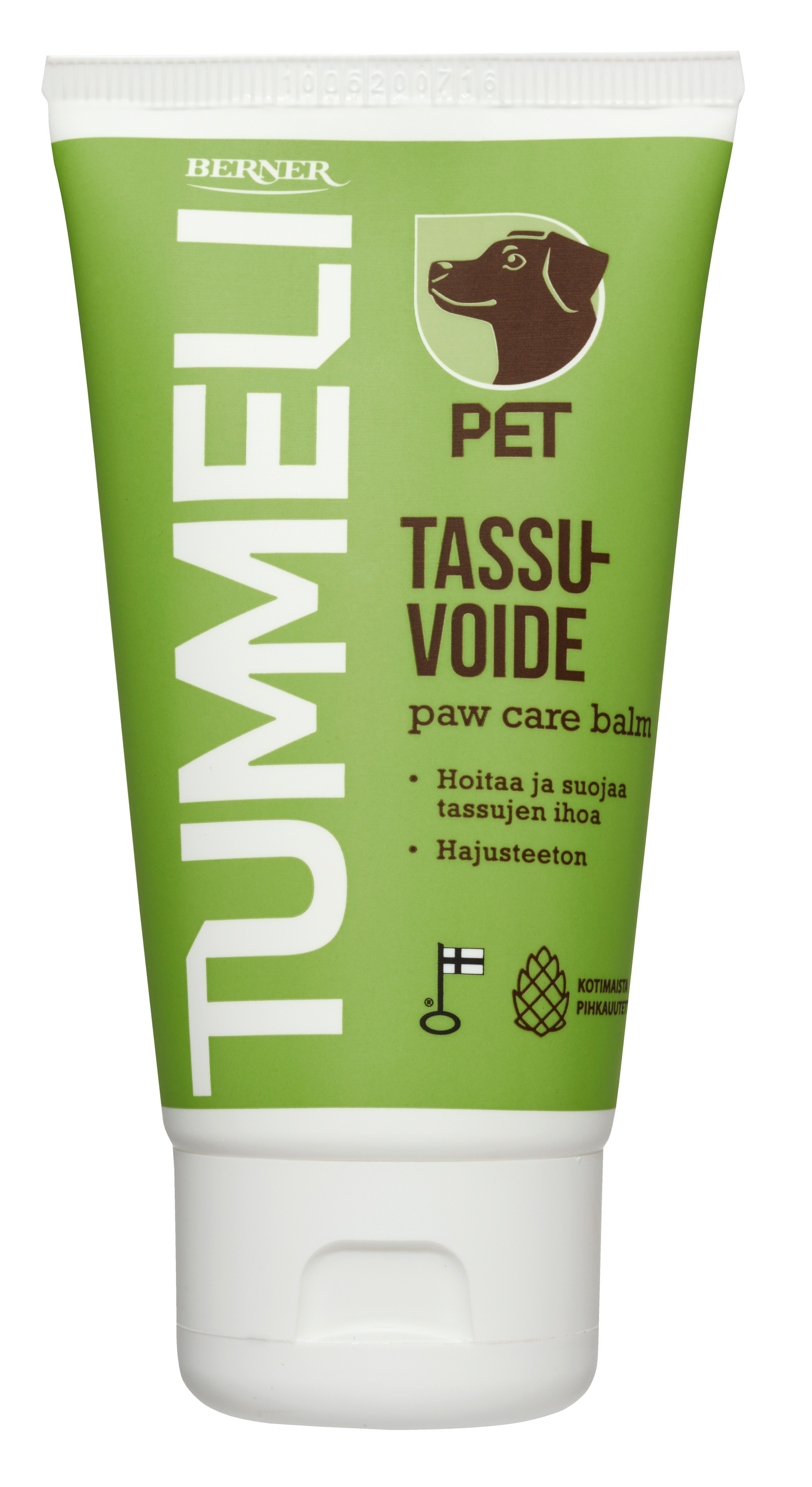 Tummeli PET tassuvoide hoitaa ja rauhoittaa ruhjeisia polkuanturoita ja lemmikin ihoa. Ylläpitää tassujen hyvinvointia ja ennaltaehkäisee halkeamia. Sisältää kotimaista pihkauutetta. Hajusteeton koostumus. Valmistettu Heinävedellä ja tuotteelle on myönnetty Avainlippu-tunnus.