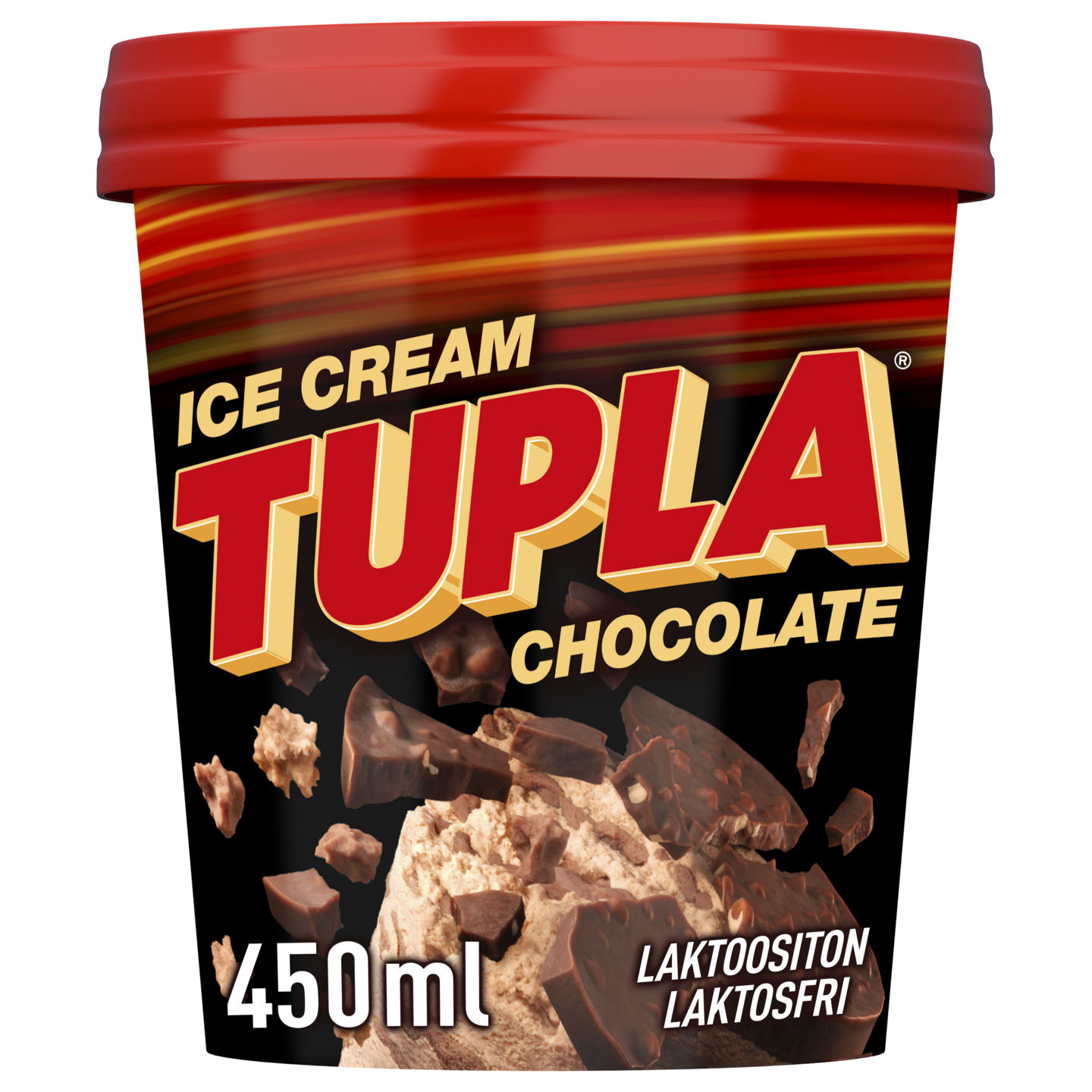 Suomalaisten rakastama ikoninen suklaapatukkabrändi Tupla on nyt jäätelöä. Tupla CHOCOLATE jäätelöpurkissa on laktoositonta suklaakermajäätelöä, kaakaonougatkastiketta, rouhittuja manteleita sekä kuorrutuksena laktoositon suklaakuori mantelirouheella. Laktoositon. Gluteeniton.