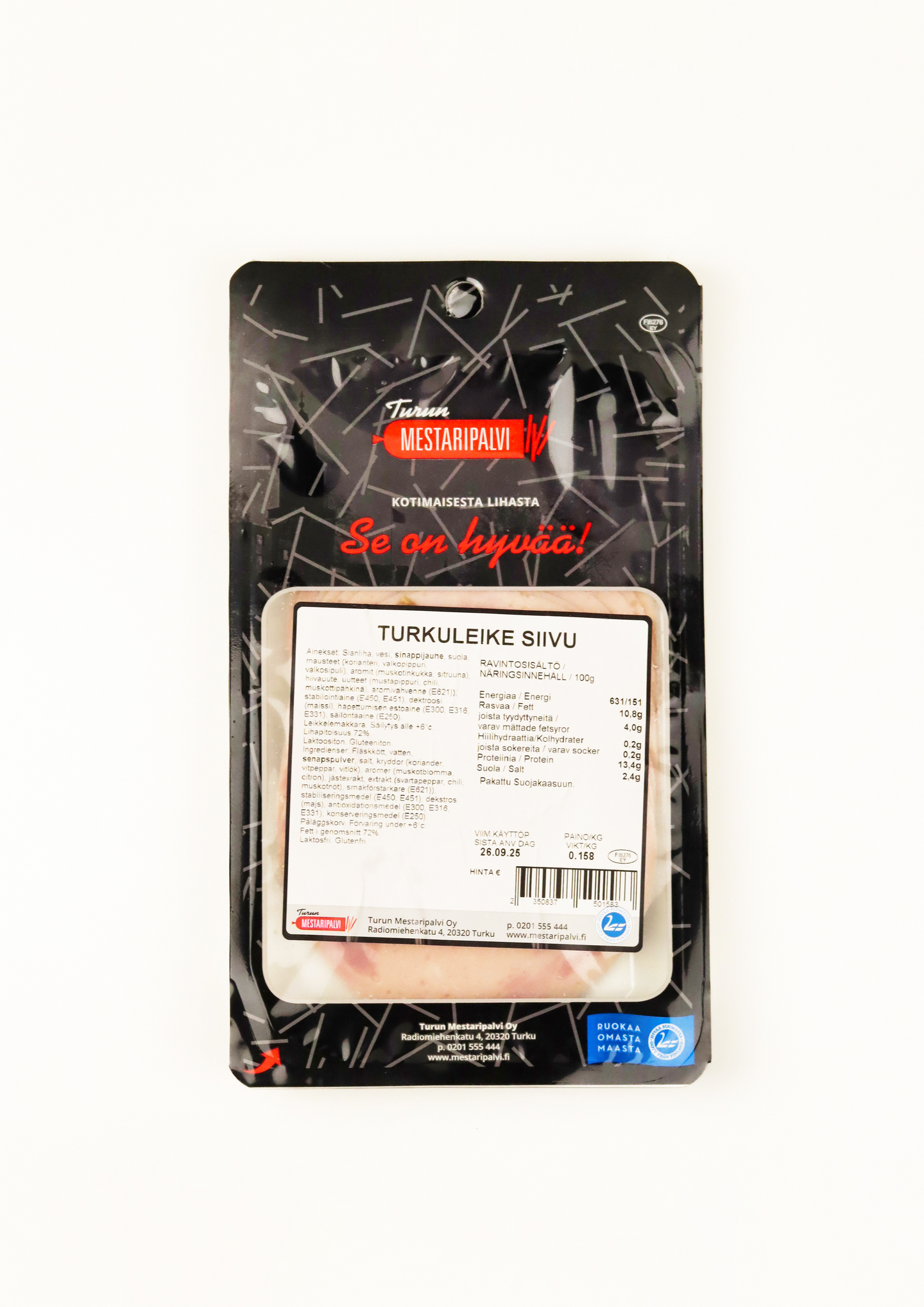 Suomessa kotimaisesta lihasta valmistettu Turkuleike-leikkelemakkara. Yksittäisen tuotteen keskimääräinen paino on 150 g.