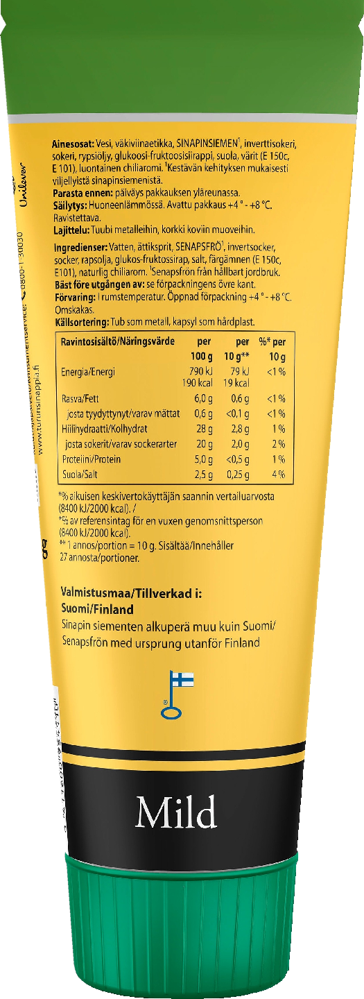 Turun Sinappia on aito suomalainen klassikko, jonka maun suomalaiset oppivat tuntemaan jo pienestä pitäen. Turun mieto sinappi kuuluu itsestäänselvyytenä suomalaiseen ruokapöytään sekä arkeen että juhlaan. Käytä ruoanlaittoon monipuoliesesti. Mieto sinappi sopii erityisen hyvin voileipien täytteeksi, burgereiden mausteeksi, höyryävän grillimakkaran kyytipojaksi ja hernekeittoon. Miedon sinapin tunnistat vihreästä pakkauksesta. Harva tuote Suomessa on yhtä tunnettu ja pidetty kuin aito Turun Sinappia. Sen valmistus alkoi Turussa 1948. Vuonna 2004 sinapin valmistus siirtyi Ruotsiin ja sieltä edelleen vuonna 2007 Puolaan. Kotiinpaluun aika koitti 2010-luvulla. Sinapin valmistus palasi ulkomailla vietettyjen vuosien jälkeen takaisin Suomeen, ei toki Turkuun vaan Pyhännälle. Vuodesta 2014 alkaen suomalaiset ovat jälleen voineet nauttia Suomessa valmistettua Turun Sinappia. Tunnettu tuote jatkaa voittoisaa taivaltaan. Sanomattakin on selvää, että sinapin resepti on tarkoin varjeltu salaisuus. Harvoja tuotteita ostetaan ihan vaan värin perusteella. Turun Sinapin tapauksessa kauppalistassa saattaa lukea vihreää sinappia (mieto), punaista (väkevä) tai mustaa (tulinen). Yli 30 vuotta sitten Turun Sinappia sai mainoslauseen, jonka tunsivat Suomessa kaikki. Sinappi oli jokaisen huulilla: "Kahta en vaihda, toinen on Turun Sinappi ja toinen..." Turun Sinappia on tuote heille, jotka haluavat nauttia elämästä, mutta eivät ota itseään turhan vakavasti. Aidosti Suomessa valmistettu Turun Sinappia sai Suomalaisen Työn Liiton Avainlippumerkin vuonna 2014, eli samana vuonna kun tuotteen valmistus siirtyi takaisin Suomeen.