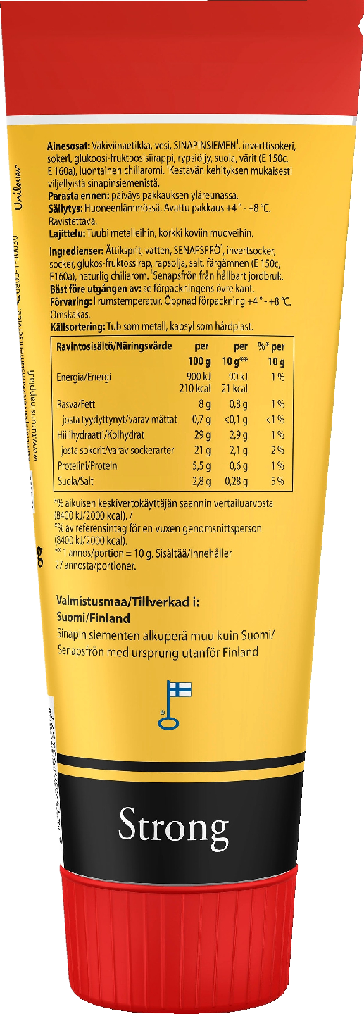 Turun Sinappi on aito suomalainen klassikko, jonka maun suomalaiset oppivat tuntemaan jo lapsesta alkaen. Turun väkevä sinappi sopii tilanteeseen kuin tilanteeseen. Käytä ruoanlaittoon – väkevä maku tuo potkua moneen ruokaan. Se sopii niin nakin kuin grillimakkaran kaveriksi. Väkevä sinappi käy erityisen hyvin joulukinkun kuorrutukseen. Tunnistat väkevän sinapin punaisesta pakkauksesta. Harva tuote Suomessa on yhtä tunnettu ja pidetty kuin aito Turun Sinappia. Sen koti on Turku, missä sinapin valmistus alkoi 1948. Vuonna 2004 sinapin valmistus siirtyi Ruotsiin ja sieltä edelleen vuonna 2007 Puolaan. Kotiinpaluun aika koitti 2010-luvulla. Sinapin valmistus palasi ulkomailla vietettyjen vuosien jälkeen takaisin Suomeen, ei toki Turkuun vaan Pyhännälle. Vuodesta 2014 alkaen suomalaiset ovat jälleen voineet nauttia Suomessa valmistettua Turun Sinappia. Tunnettu tuote jatkaa voittoisaa taivaltaan. Sanomattakin on selvää, että sinapin resepti on tarkoin varjeltu salaisuus. Harvoja tuotteita ostetaan ihan vaan värin perusteella. Turun Sinapin tapauksessa kauppalistassa saattaa lukea vihreää sinappia (mieto), punaista (väkevä) tai mustaa (tulinen). Yli 30 vuotta sitten Turun Sinappia sai mainoslauseen, jonka tunsivat Suomessa kaikki. Sinappi oli jokaisen huulilla: "Kahta en vaihda, toinen on Turun Sinappi ja toinen..." Turun Sinappia on tuote heille, jotka haluavat nauttia elämästä, mutta eivät ota itseään turhan vakavasti. Aidosti Suomessa valmistettu Turun Sinappia sai Suomalaisen Työn Liiton Avainlippumerkin vuonna 2014, eli samana vuonna kun tuotteen valmistus siirtyi takaisin Suomeen.