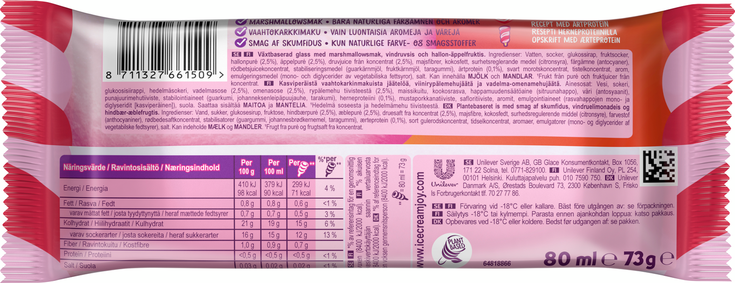 Spiraalinmuotoinen Twister Mallow -jäätelöpuikko on jännittävä, uudenlainen jäätelökokemus! Tässä uudessa Twister-jäätelössä yhdistyy tutut hedelmäiset maut ja lasten ikisuosikki – vaahtokarkki! Oletko jo maistanut? Twister Mallow -jäätelöpuikko on täynnä hedelmäistä makua ja maistuvaa jäätelöä – toisin sanoen täydellinen aurinkoisten kesäpäivien viilentäjä tai talvisten koti-iltojen ilostuttaja! Spiraalinmuotoinen mehujääpuikko sisältää vaahtokarkinmakuista jäätelöä, kirpeitä vadelmanmakuisia mehujääkierteitä sekä viinirypäleenmakuisen mehujääytimen. Todellinen makujen Twister! Twister Mallow -jäätelöpuikko on kasvipohjainen lasten suosikki, joka on valmistettu luonnollisesta hedelmämehusta ja siinä maistuu vaahtokarkki, viinirypäle ja vadelma. Se sisältää vain luonnollisia väri- ja makuaineita, joten voit nauttia sitä hyvällä omallatunnolla. Nauti nyt yksin tai yhdessä muiden kanssa – Twister Mallow on koko perheen suosikki, joka jää mieleen! Jäätelö on superhelppo, ihanan viileä jälkiruoka, joka maistuu lähes jokaiselle, niin lapsille kuin aikuisille. Jäätelö on ratkaisu pieneen makeannälkään tai silloin, kun saat yllätysvieraita ja haluat hieman juhlistaa tilaisuutta. Jäätelö ilostuttaa päivän pienissä hetkissä ja nostaa tavanomaisenkin ruokailun arjen yläpuolelle. Eniten jäätelöä syödään kesäkuukausina, mutta useimpien mielestä jäätelö maistuu yhtä hyvälle vuodenajasta riippumatta. Muista, että jäätelö säilyy parhaiten -18 asteen lämpötilassa tai kylmemmässä. Jäätelöillämme on vahva yhteys kaikenikäisten jäätelörakastajien kanssa ja haluamme olla mukana ilon hetkissä. Jäätelövalikoimastamme löytyy tuttuja klassikoita ja jännittäviä uutuuksia, joita kehitämme muuttuvien makujen mukaan. Unileverin jäätelöt luovat päivittäin onnenhetkiä ihmisille ympäri maailmaa. Juhlistamme tätä toimintaa sponsoroimalla virallisesti Yhdistyneiden kansakuntien kestävän kehityksen ratkaisuverkoston (SDSN) onnellisuusraporttia. Olemme tuoneet ihmisiä yhteen jäätelön avulla ja levittäneet onnellisuutta sosiaalisten yhteyksien kautta. Sponsorointisopimus on uusin askel Unileverin sitoutumisessa kansallisten onnellisuustasojen nostamiseen. Se on osa meidän pyrkimystä korostaa ihmisten välisten sosiaalisten yhteyksien merkitystä onnellisuuden lisäämisessä. Jäätelöillämme on vahva yhteys kaikenikäisten jäätelörakastajien kanssa ja haluamme olla mukana ilon hetkissä. Jäätelövalikoimastamme löytyy tuttuja klassikoita ja jännittäviä uutuuksia, joita kehitämme muuttuvien makujen mukaan.