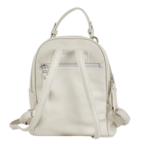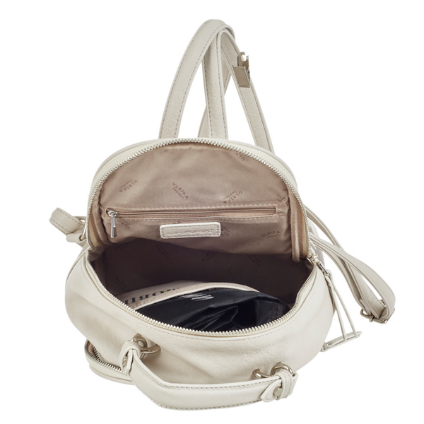 Pieni cityreppu kahvalla ja säädettävillä olkaimilla. Taskuja riittää niin edessä takana kuin keskelläkin, kaikki vetoketjulla suljettavia. Pääosastoissa vielä avotaskuja puhelimelle, avaimille ym. Mukana Ulrika-kestokassi. Mitat: 23 x 26 x 11 cm.