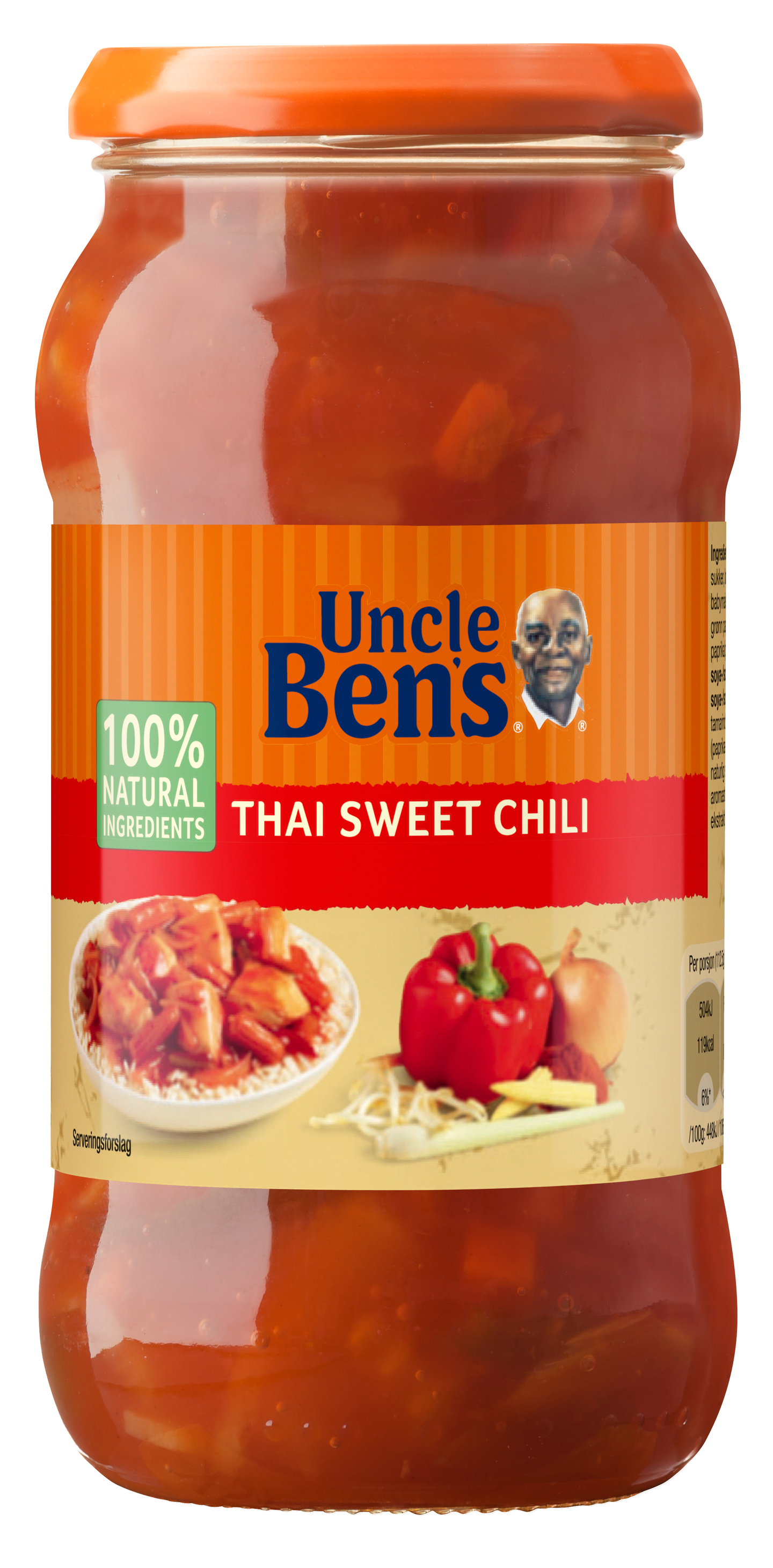 Makean voimakkaassa Uncle Ben's® Thai Sweet Chili -kastikkeessa on rapeita vihanneksia. Punaisen chilin ja sitruunaruohon aito maku tuovat mieleen Thaimaan. Se sisältää vain korkealaatuisia aineosia. Ilman keinotekoisia maku-, väri- ja säilöntäaineita. Saat aina täydellisiä tuloksia, kun tarjoilet sen kera keittopussissa keitettyä Uncle Ben’s® Jasmiiniriisiä.