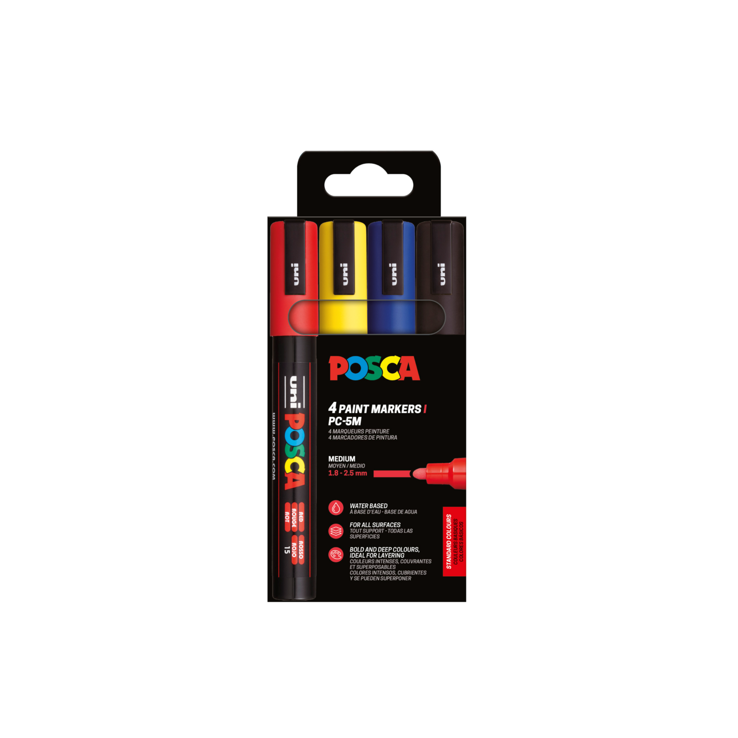 Posca setissä on 4 kappaletta PC-5M kynää. Värit: punainen, keltainen, sininen ja musta. Kynissä on medium 1,8-2,5 mm polyesterkärki. POSCA on korkealaatuinen vesipohjainen tussi. Valikoima koostuu laajasta värivalikoimasta. Kynän jälki on peittävä ja se soveltuu hyvin erilaisille pinnoille kuten kartongille, kivelle, tekstiileille, puulle, muoville, keramiikalle, metallille ja lasille. Useimmilla pinnoilla suositellaan käytettäväksi suojaavaa lakkaa ja uunissa kuumentamista, jotta lopputuloksesta tulee kestävä. Sulje korkki tiiviisti käytön jälkeen.