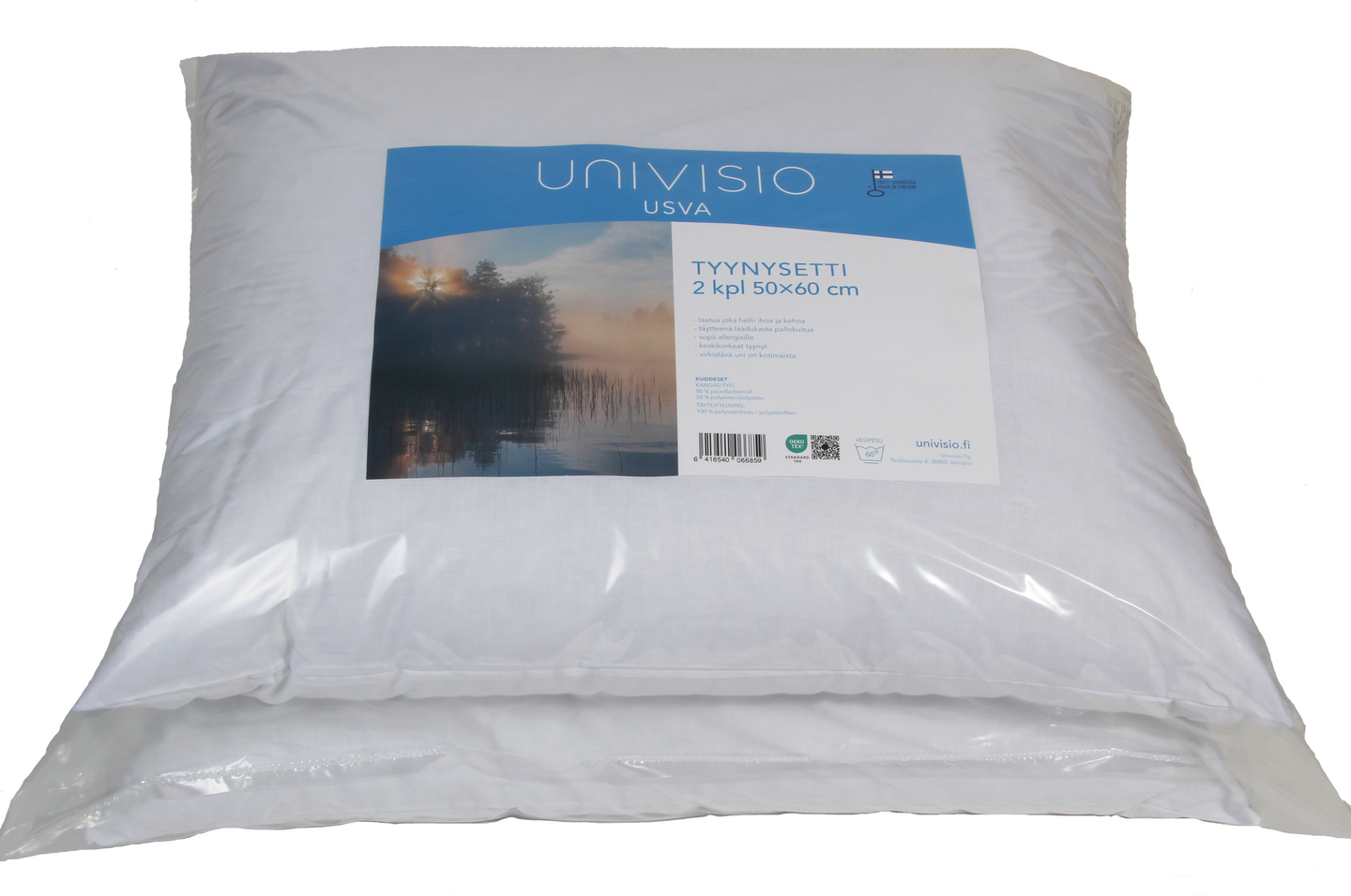 Univisio Usva tyynysetissä on kaksi valkoista keskikorkeaa tyynyä koossa 50x60 cm, jotka soveltuvat erinomaisesti selällään ja kyljellään nukkujalle. Kangas on tiivistä, sileää ja kestävää sekoitetta 50% puuvillaa, 50% polyesteria. Tyynyn täytteenä on kimmoisaa polyesteripallokuitua 420 g (GRS-sertifioitu kierrätyskuitu). Vesipesu 60 astetta. Avainlipputuote, valmistettu Suomessa.
