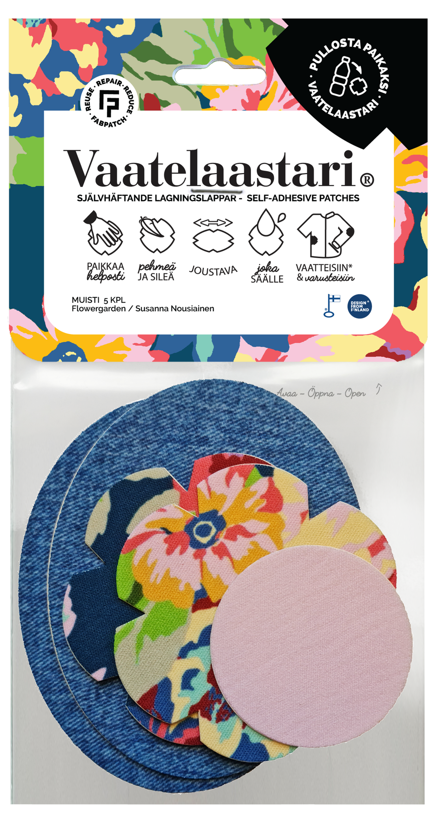 Pakkauksessa on kaksi Flowergarden-kuosia, kaksi farkku ja yksi vaalea pinkki paikka. Flowergarden-kuosin suunnittelija on Susanna Nousiainen.
