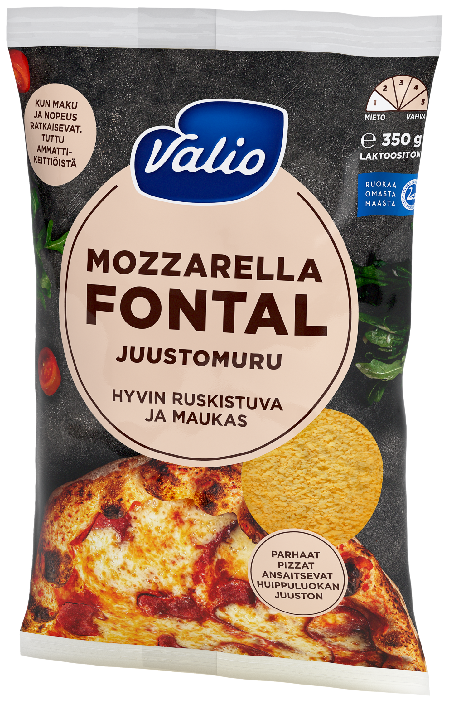 Valio mozzarella-fontal juustomuru – parhaisiin pizzoihin, intohimoisille pizzanpaistajille! Juusto kruunaa pizzan ja sitoo maut herkullisesti yhteen. Fontalin ja mozzarellan yhdistelmä on lempeän täyteläinen, mehevä ja venyvyydeltään pizzaan täydellisen sopiva. Jos paistat pizzoja useammalle, ammattikeittiöistä tuttu murumuoto helpottaa ja nopeuttaa tekemistä: Valio mozzarella-fontal juustomurua on helppo levittää pizzan päälle juuri oikea määrä. Se myös saa uunissa väriä kauniisti ja tasaisesti ja kestää hyvin kuumuutta.