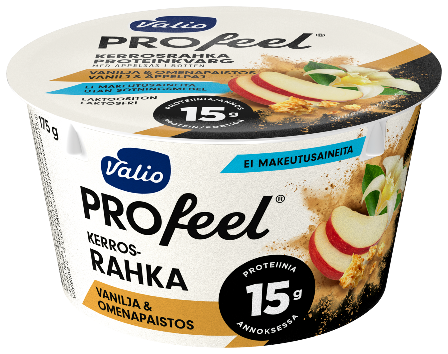 Valio PROfeel® kerrosrahkalla ruokit tavoitteitasi raikkaasti! Runsasproteiininen kerrosvälipala yhdistää pehmeästi lusikoitavaan vaniljarahkaan omenapaistoksen makuisen kerroksen herkullisilla omenapaloilla. Poimi lusikkaan molempia kerroksia tai sekoita. Nopea ja raikas vaihtoehto aamu- tai välipalaksi sekä treenien jälkeen. Sokerilla makeutettu ja laktoositon tuote.