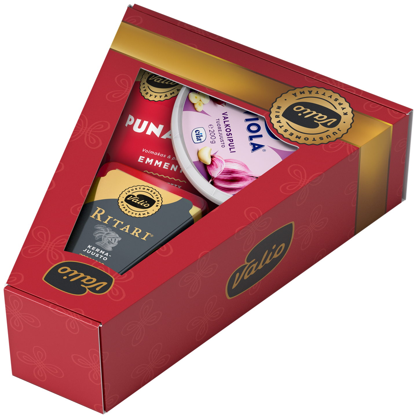 Valio punainen juustopakkaus on laadukas lahja, joka on helppo antaa. Se sopii mainiosti myös joulun ajan tuliaiseksi. Lahjapakkaus sisältää kolme huolella valittua juustoa, jotka ilahduttavat taatusti juustojen ystävää: Valio Emmental punaleima, Valio Ritari® ja Valio Viola® valkosipuli tuorejuusto. Juustojen seuraan sopivat esimerkiksi Valio glögi, piparit, hedelmät ja hillokkeet. Joulun 2023 kausituote.