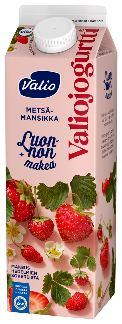 Valiojogurtti® Luonnon makea -tuoteperhe on maukas sarja välipaloja, joiden makeus tulee hedelmien sokereista. Pehmeä ja laktoositon metsämansikkajogurtti maistuu koko perheelle. Sisältää makoisia metsämansikkapaloja. Maista ja ihastu! Koko Valiojogurtti®-tuoteperhe on laktoositon.