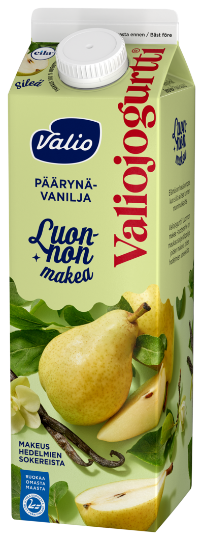 Valiojogurtti® Luonnon makea -tuoteperhe on maukas sarja välipaloja, joiden makeus tulee hedelmien sokereista. Pehmeä ja sileä laktoositon päärynä-vaniljajogurtti maistuu koko perheelle. Maista ja ihastu! Koko Valiojogurtti®-tuoteperhe on laktoositon.