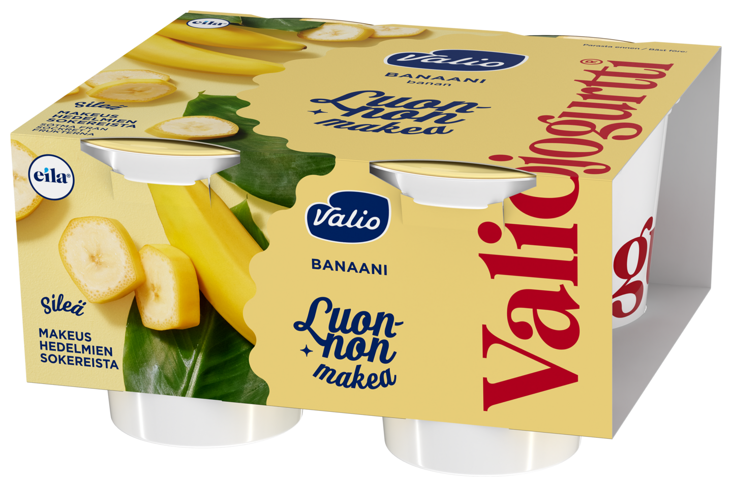 Valiojogurtti® Luonnon makea -tuoteperhe on maukas sarja välipaloja, joiden makeus tulee hedelmien sokereista. Pehmeä ja sileä laktoositon banaanijogurtti maistuu koko perheelle. Tuote on pakattu kätevään neljän jogurtin monipakkaukseen (4 x 125 g). Maista ja ihastu! Koko Valiojogurtti®-tuoteperhe on laktoositon.
