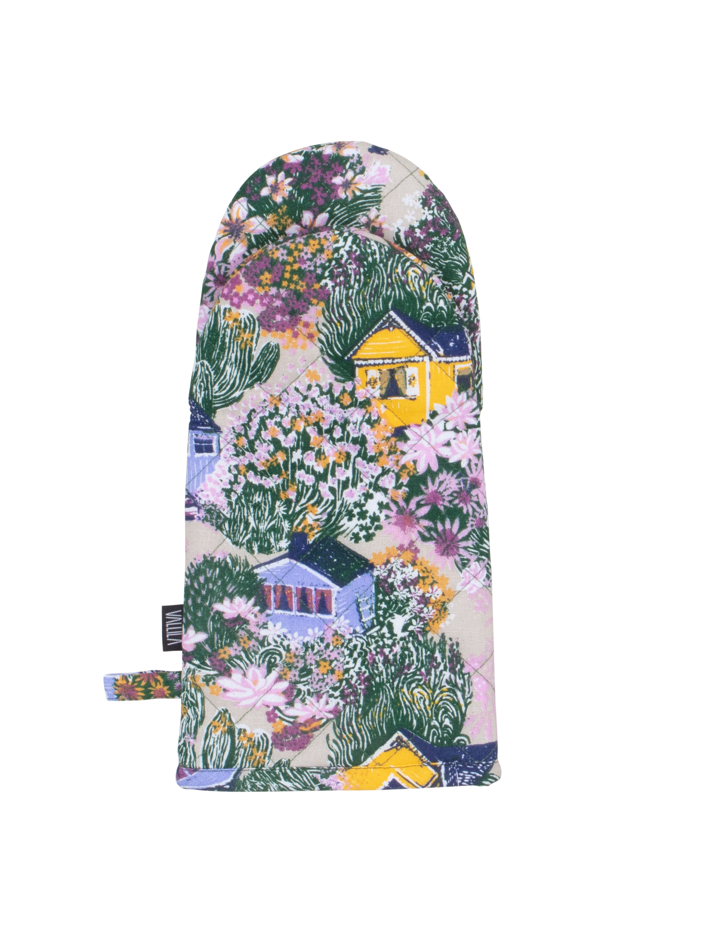 Kodikasta kesätunnelmaa tarjoaa Matleena Issakaisen suunnittelema hyväntuulinen Huvilapolku-kuosi siirtolapuutarhamaisine mökkeineen ja ihastuttavine yksityiskohtineen. Vallilan puuvillaisen Huvilapolku-patakintaan koko on 16x33 cm. Öko-Tex ja Design from Finland.
