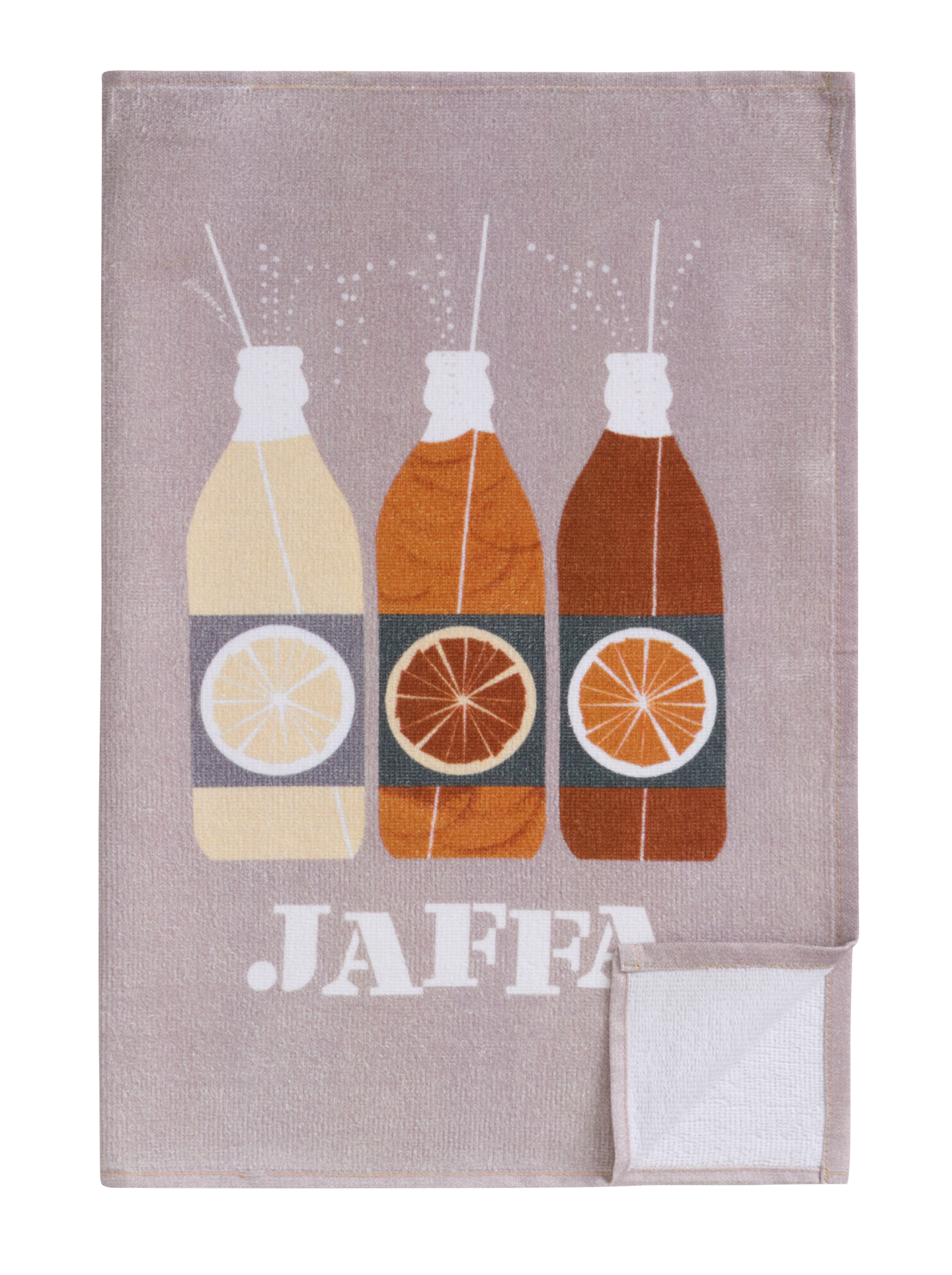 Erik Bruunin suunnittelema Jaffa-julistekuosi, tuo 1950-luvun suosikki, tekee taas näyttävän paluun Vallilan mallistoon. Jaffa on pirskahteleva, raikas, selkeä ja energisen iloinen kuosi. Jaffa-pullot, nuo houkuttelevat janonsammuttajat, tuovat piristystä sisustukseen ja jokaiseen päivään. Jaffa-pyyhe on 100% puuvillaa.