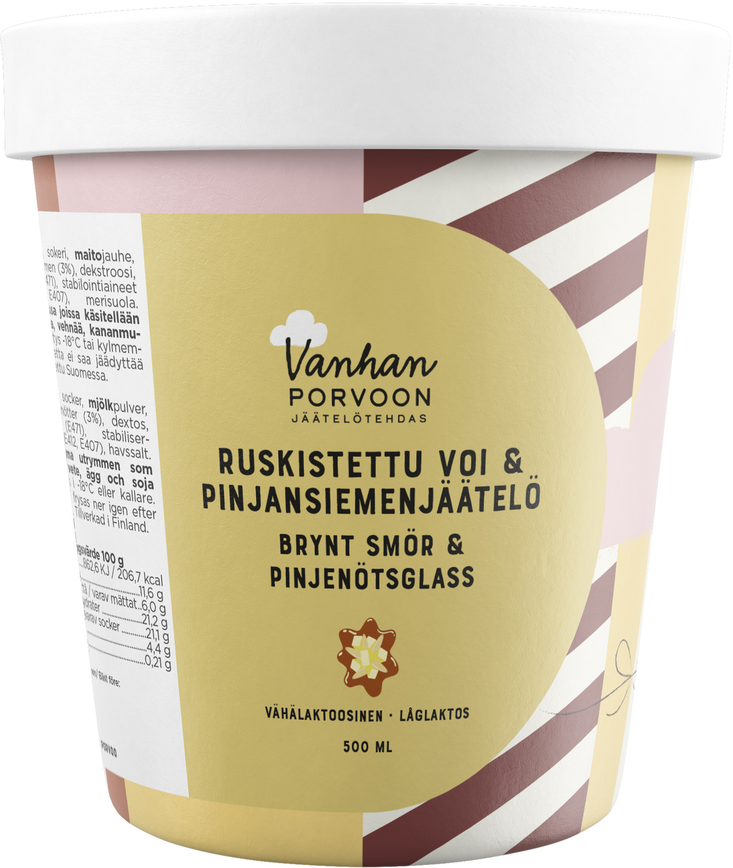 Tässä kestosuosikissamme yhdistyy karamellisen pähkinäinen ruskistettu voi sekä paahteiset pinjansiemenet. Kokeile ja ihastu tähän ihanan täyteläiseen makuun. Vanhan Porvoon Jäätelötehtaalla jäätelö syntyy paikallisia raaka-aineita kunnioittaen ja jokainen jäätelöerämme tehdään suurella rakkaudella sekä ammattiylpeydellä. Runsaan makuvalikoimamme ansiosta jokainen jäätelöhetkesi voi olla ainutlaatuinen ja yllättävä. Ole oman elämäsi artesaani ja ihastu iloisesti jäätelöihimme yhä uudestaan.