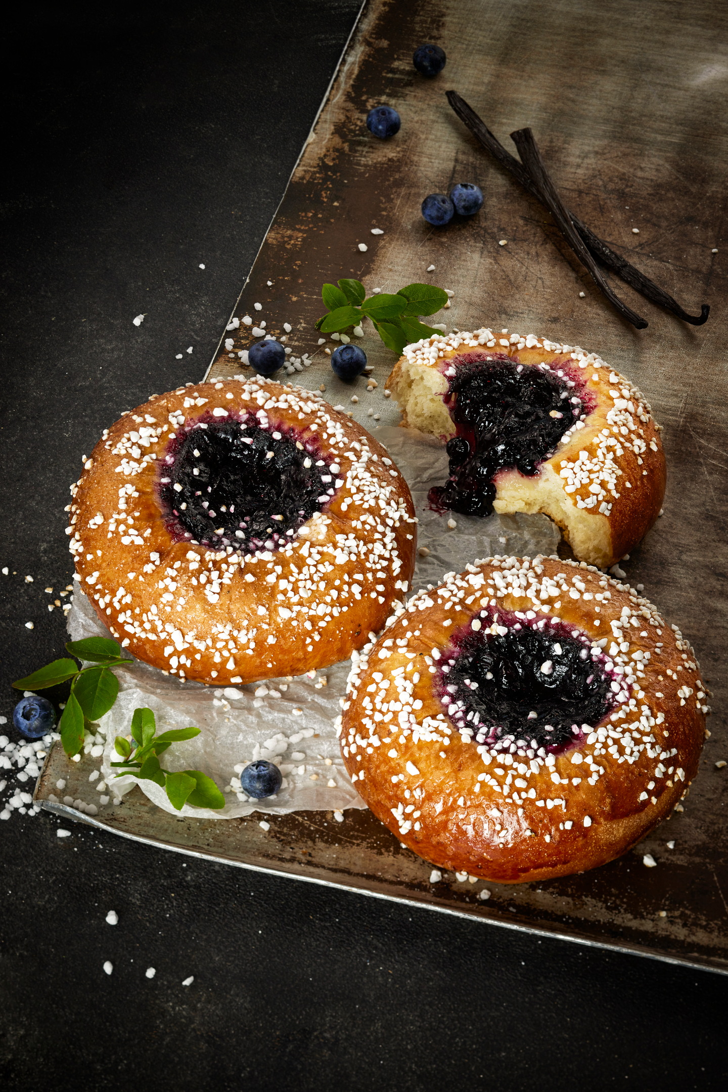 Käsin tehty herkullinen pulla, missä runsaasti itse tehtyä vanilja-mustikkatäytettä. Yksittäisen tuotteen keskimääräinen paino on 160 g.