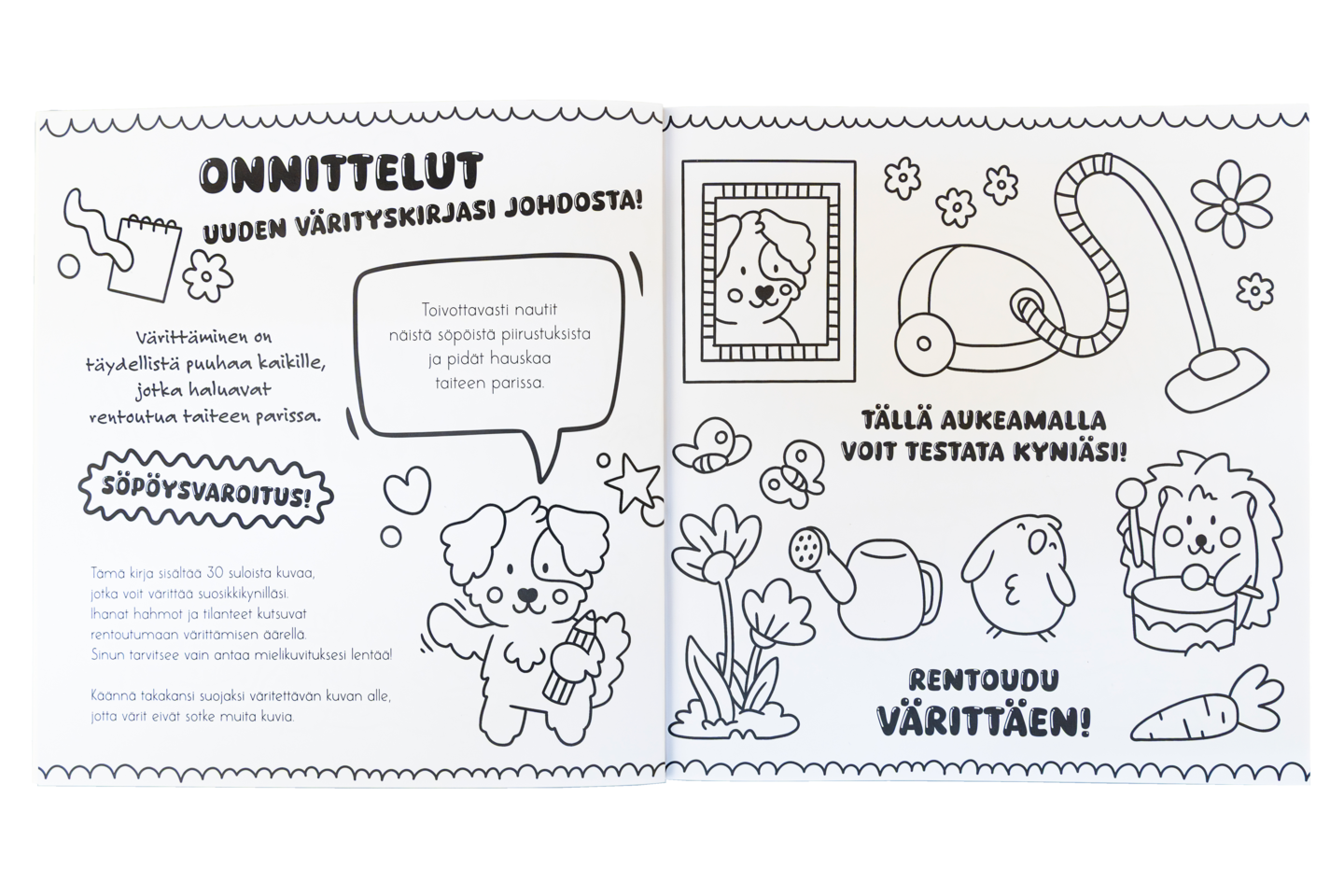 Söpöliinit-värityskirja on saanut inspiraationsa kasvavasta luovien värityskirjojen trendistä. Kirjat on suunniteltu väritettäviksi maalitusseilla. Hurmaavat kissat, puput, siilit ja koiranpennut valloittavat isommatkin värittäjät. Värityskirjat kehittävät hienomotorisia taitoja, keskittymiskykyä ja luovuutta. Väritys auttaa myös rentoutumaan ja vähentämään stressiä, mikä tukee kokonaisvaltaista hyvinvointia. Itseilmaisun iloa!
