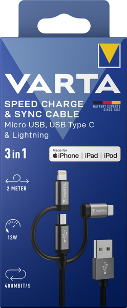 VARTA Speed Charge & Sync 3in1 – lataus- ja datakaapeli kolmella eri liitäntävaihto-ehdolla: microUSB, USB Type C ja Lightning. Älykäs ja monipuolinen ratkaisu kaikille yleisimmille USB-ladattaville laitteille! Virransiirto 12W ja 480 Mbps:n tiedonsiirto - siirtää esim. 20 musiikkikappaletta sekunnissa.