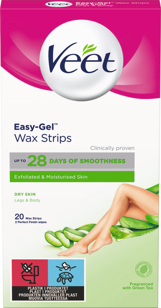 Veet Easy-Gel vahaliuskat irrottavat ihokarvat tyvestä asti ja pitävät ihosi sileänä jopa 28 päivän ajan. Vahaliuskojen geeli tarttuu tehokkaasti myös lyhyisiin karvoihin, mutta ei ihoon. Veet Easy-Gel vahaliuskat ovat helppokäyttöisiä ja ne jättävät ihon pehmeän ja kosteutetun tuntuiseksi. Kuivalle iholle sopivien vahaliuskojen geeli sisältää kosteuttavaa aloe veraa ja on hajustettu vihreällä teellä.