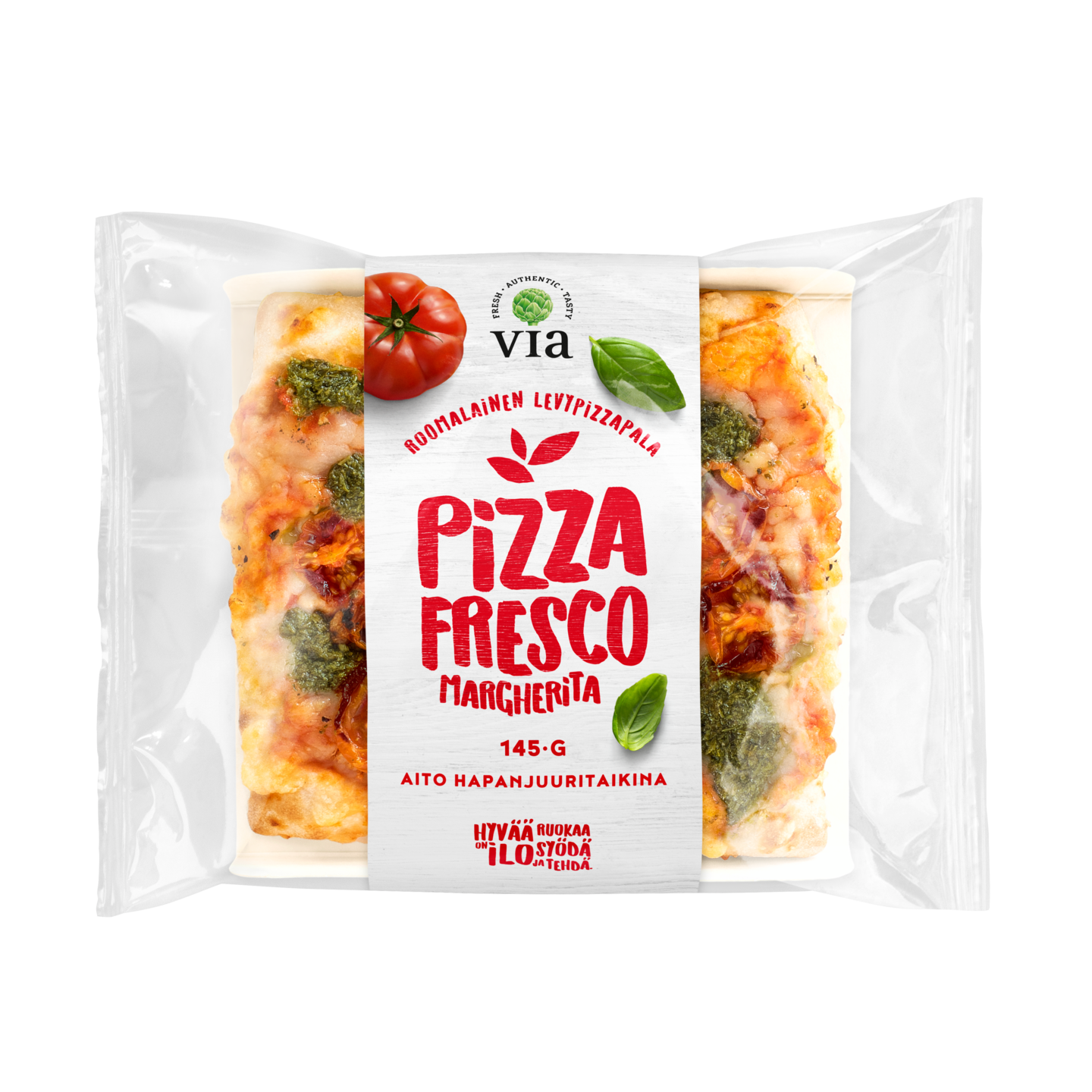 Aitoon hapanjuuritaikinaan leivottu pohja, päällä maukasta tomaattikastiketta, tomaattia, pähkinätöntä pestoa ja mozzarellaa. Buon appetito!