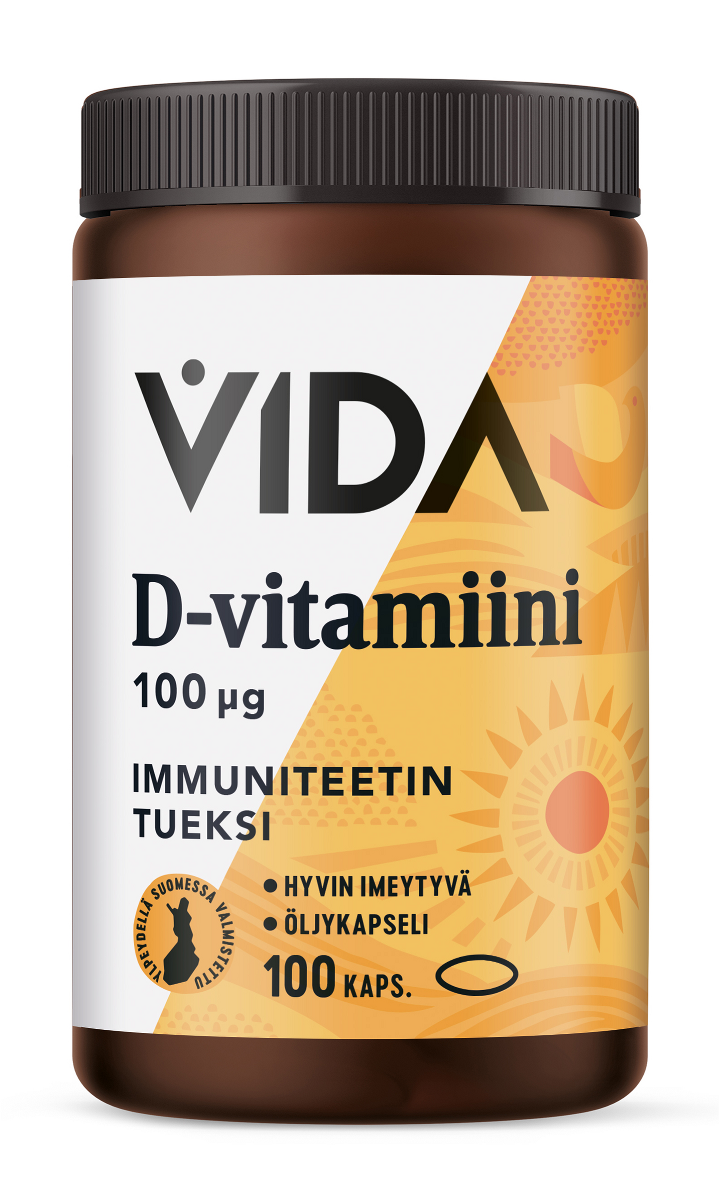 Kotimainen Vida D-vitamiini edistää luiden pysymistä normaaleina ja immuunijärjestelmän normaalia toimintaa. Tehostaa kalsiumin imeytymistä. Pienessä helposti nieltävässä kapselissa oleva laadukas extra neitsytoliiviöljy tehostaa D3-vitamiinin imeytymistä. Laktoositon. Gluteeniton. Hiivaton.