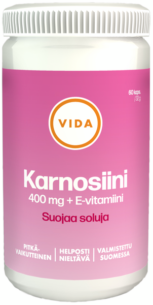 Kotimainen ja pitkävaikutteinen Vida Karnosiini sisältää myös E-vitamiinia. Karnosiini on kahden aminohapon, β-alaniinin ja histidiinin muodostama dipeptidi, jota ihmisessä on luonnostaan muun muassa lihaksistossa, maksassa ja aivoissa. Tuote on pitkävaikutteinen ja se edistää solujen suojaamista hapettumisstressiltä. Aktiiviliikkujille ja ikääntyville. Soveltuu myös vegaaneille. Laktoositon, gluteeniton, hiivaton.