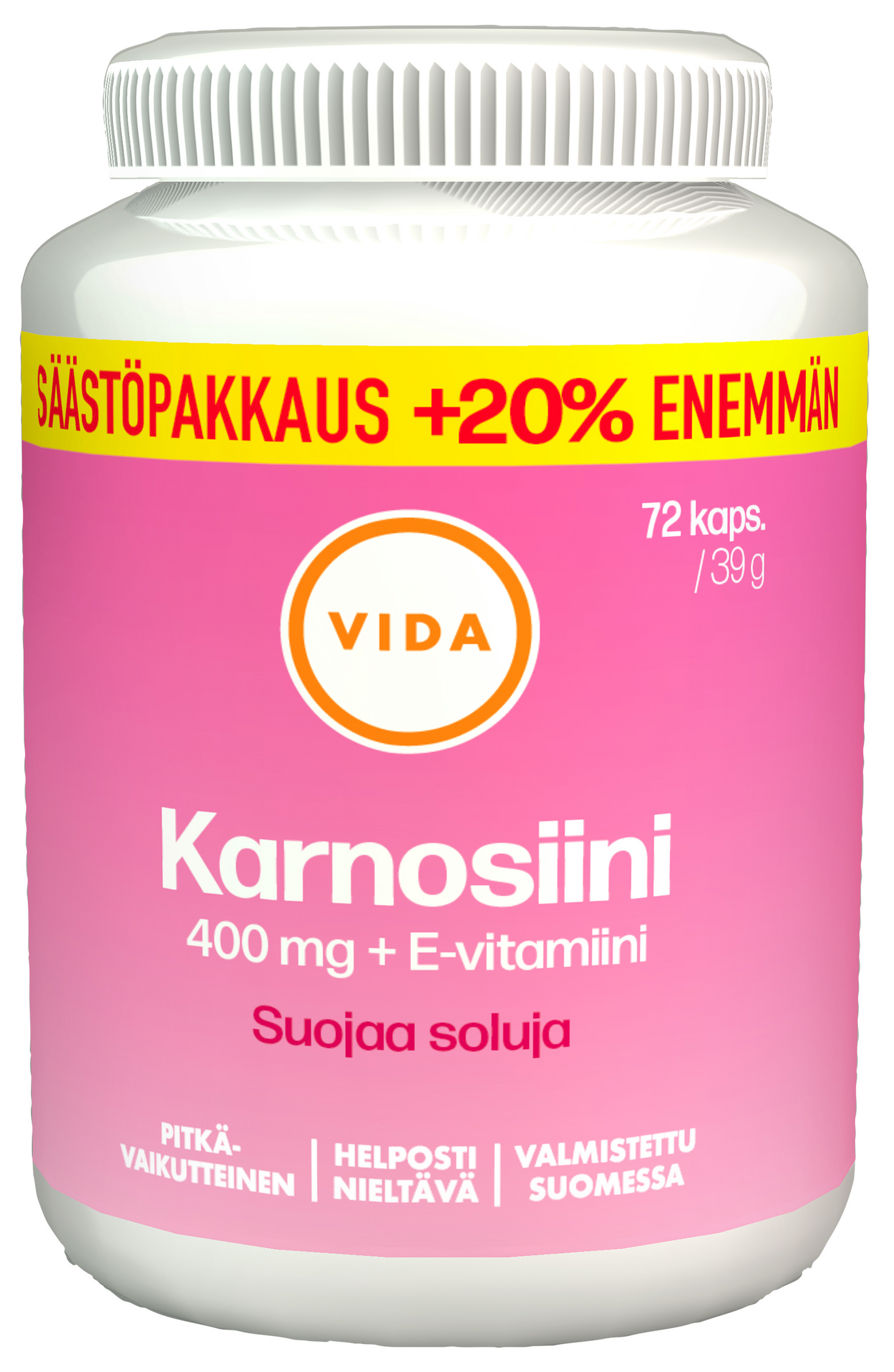 Kotimainen ja pitkävaikutteinen Vida Karnosiini sisältää myös E-vitamiinia. Karnosiini on kahden aminohapon, β-alaniinin ja histidiinin muodostama dipeptidi, jota ihmisessä on luonnostaan muun muassa lihaksistossa, maksassa ja aivoissa. Tuote on pitkävaikutteinen ja se edistää solujen suojaamista hapettumisstressiltä. Aktiiviliikkujille ja ikääntyville. Soveltuu myös vegaaneille. Laktoositon, gluteeniton, hiivaton.