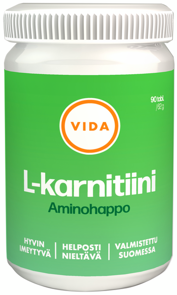 Kotimainen Vida L-karniitiini valmiste on hyvin imeytyvää L-karnitiinitartraattia. Karnitiini on aminohappo, joka muun muassa kuljettaa solun sisällä rasvahappoja mitokondrioihin pilkottaviksi energiaksi. Hyvin imeytyvä ja helposti nieltävä tabletti. Soveltuu myös vegaaneille. Laktoositon, gluteention, hiivaton.