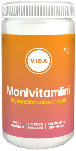 Kotimainen Vida Monivitamiini on tarkoitettu kaikkien tärkeiden vitamiinien ja mineraalien saannin varmistamiseksi. Vida Monivitamiini sisältää 23 eri vitamiinia ja hivenainetta yhdessä helposti nieltävässä tabletissa. Vida Monivitamiini edistää energian saantia, hyvää vastustuskykyä sekä kaunista ihoa ja tuuheita hiuksia. Laktoositon. Gluteeniton. Hiivaton.